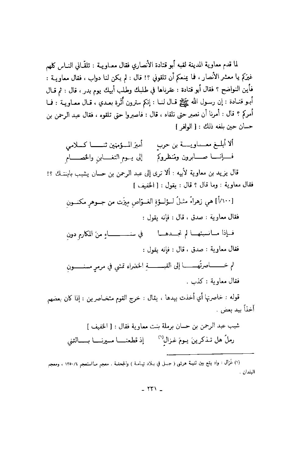 لما قدم معاوية المدينة لقيه أبو قتادة الأنصاري فقال معاوية: تلقاني الناس كلهم غيركم يا معشر الأنصار، فما يمنعكم أن تلقوني؟! قال: لم يكن لنا دواب، قال معاوية: فأين النواضح؟ فقال أبو قتادة: عقرناها في طلبك وطلب أبيك يوم بدر، قال: ثم قال أبو قتادة: إن رسول الله صَلَّى اللهُ عَلَيْهِ وَسَلَّمَ قال لنا: إنكم سترون أثرة بعدي، قال معاوية: فما أمركم؟ قال: أمرنا أن نصبر حتى نلقاه، قال: فاصبروا حتى تلقوه، فقال عبد الرحمن بن حسان حين بلغه ذلك: الوافر