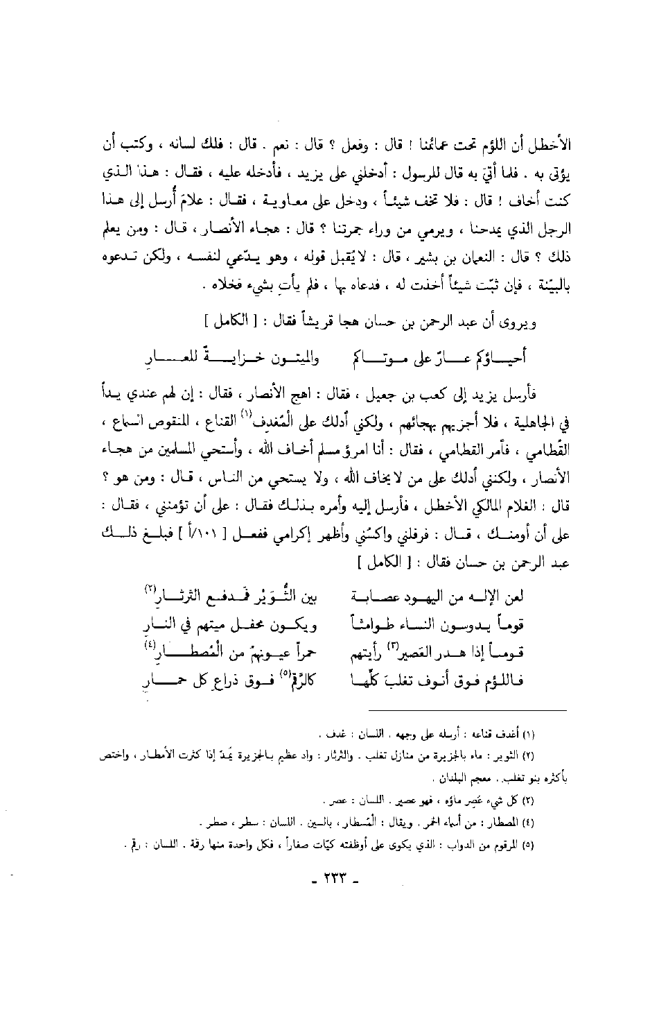 فأرسل يزيد إلى كعب بن جعيل، فقال: اهج الأنصار، فقال: إن لهم عندي يداً في الجاهلية، فلا أجزيهم بهجائهم، ولكني أدلك على المغدف القناع، المنقوص السماع القطامي، فأمر القطامي، فقال: أنا امرؤ مسلم أخاف الله، وأستحي المسلمين من هجاء الأنصار، ولكني أدلك على من لا يخاف الله، ولا يستحي من الناس، قال: ومن هو؟ قال: الغلام المالكي الخطل، فأرسل إليه وأمره بذلك فقال: على أن تؤمنني، فقال: على أن أومنك، قال: فرفلني واكسني وأظهر إكرامي ففعل فبلغ ذلك عبد الرحمن بن حسان فقال: الكامل