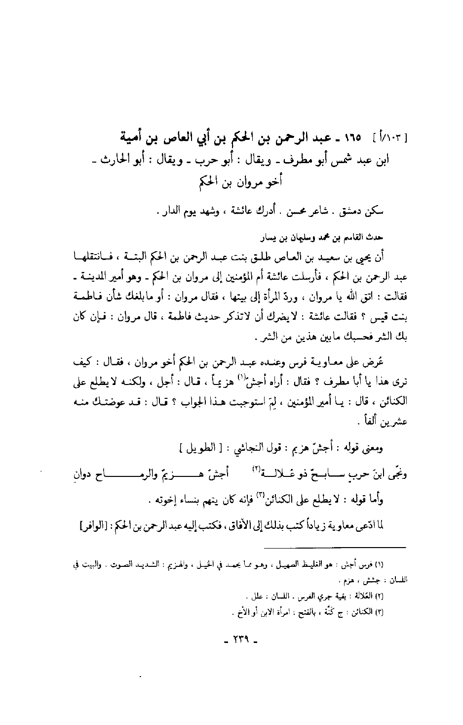 عرض على معاوية فرس وعنده عبد الرحمن بن الحكم أخو مروان، فقال: كيف ترى هذا يا أبا مطرف؟ فقال: أراه أجش هزيماً، قال: أجل، ولكنه لا يطلع على الكنائن، قال: يا أمير المؤمنين، لم استوجبت هذا الجواب؟ قال: قد عوضتك منه عشرين ألفاً.