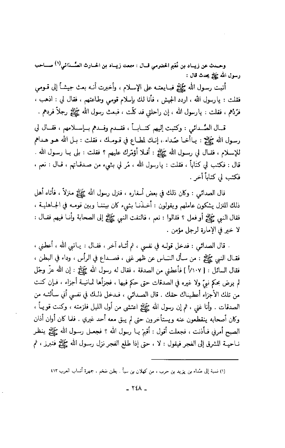وحدث عن زياد بن نعيم الحضرمي قال: سمعت زياد بن الحارث الصدائي صاحب رسول الله صَلَّى اللهُ عَلَيْهِ وَسَلَّمَ يحدث قال: وحدث عن زياد بن نعيم الحضرمي قال: سمعت زياد بن الحارث الصدائي صاحب رسول الله صَلَّى اللهُ عَلَيْهِ وَسَلَّمَ يحدث قال: أتيت رسول الله صَلَّى اللهُ عَلَيْهِ وَسَلَّمَ فبايعته على الإسلام، وأخبرت أنه بعث جيشاً إلى قومي فقلت: يا رسول الله، اردد الجيش، فأنا لك بإسلام قومي وطاعتهم، فقال لي: اذهب، فردهم، فقلت: يا رسول الله، إن راحلتي قد كلت، فبعث رسول الله صَلَّى اللهُ عَلَيْهِ وَسَلَّمَ رجلاً فردهم.