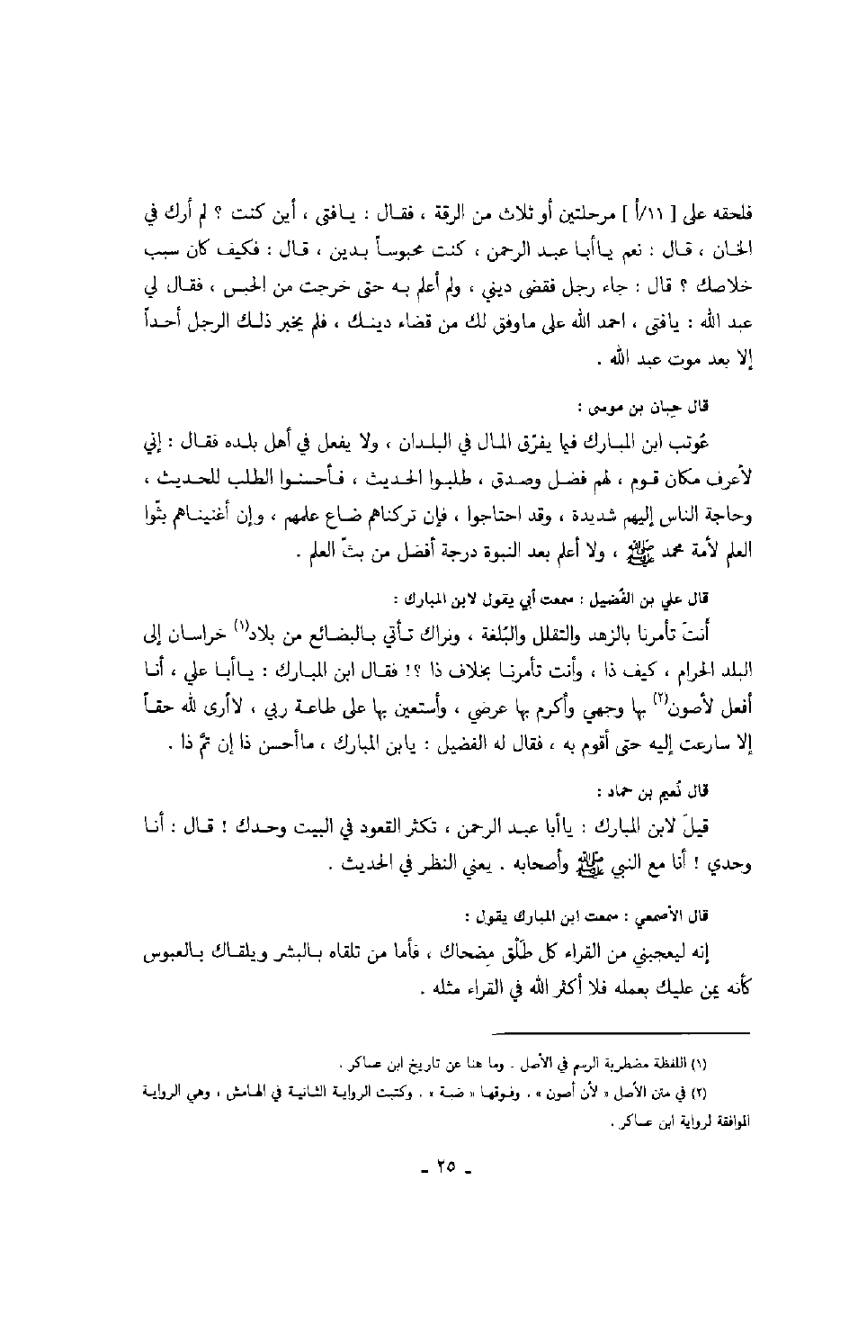 فلحقه على مرحلتين أو ثلاث من الرقة، فقال: يا فتى، أين كنت؟ لم أرك في الخان، قال: نعم يا أبا عبد الرحمن، كنت محبوساً بدين، قال: فكيف كان سبب خلاصك؟ قال: جاء رجل فقضى ديني، ولم أعلم به حتى خرجت من الحبس، فقال لي عبد الله: يا فتى، احمد الله على ما وفق لك من قضاء دينك، فلم يخبر ذلك الرجل أحداً إلا بعد موت عبد الله.