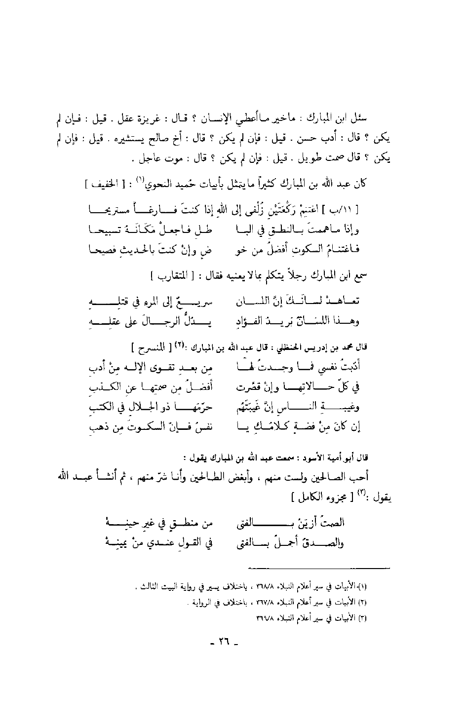 كان عبد الله بن المبارك كثيراً كان يتمثل بأييات حميد النحوي: الخفيف