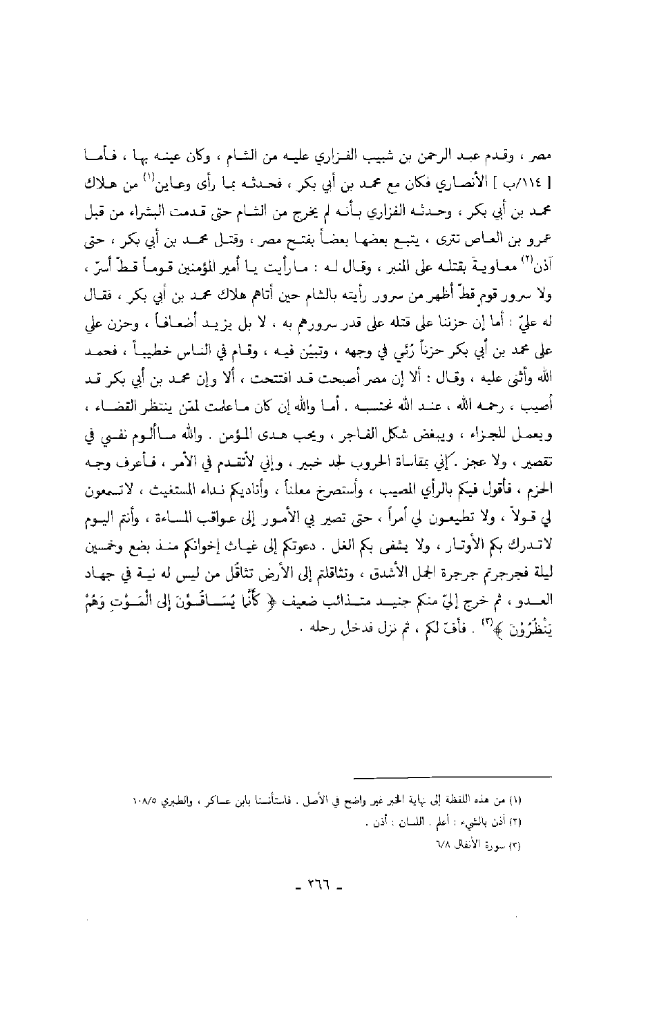مصر، وقدم عبد الرحمن بن شبيب الفزاري عليه من الشام، وكان عينه بها، فأما الأنصاري فكان مع محمد بن أبي بكر، فحدثه بما رأى وعاين من هلاك محمد بن أبي بكر، وحدثه الفزاري بأنه لم يخرج من الشام حتى قدمت البشراء من قبل عمرو بن العاص تترى، يتبع بعضها بعضاً بفتح مصر، وقتل محمد بن أبي بكر، حتى آذن معاوية بقتله على المنبر، وقال له: ما رأيت يا أمير المؤمنين قوماً قط أسر، ولا سرور قومٍ قط أظهر من سرور رأيته بالشام حين أتاهم هلاك محمد بن أبي بكر، فقال له علي: أما إن حزننا على قتله على قدر سوروهم به، لا بل يزيد أضعافاً، وحزن علي على محمد بن أبي بكر حزناً رئي في وجهه، وتبين فيه، وقام في الناس خطيباً، فحمد الله وأثنى عليه، وقال: ألا إن مصر أصبحت قد افتتحت، ألا وإن محمد بن أبي بكر قد أصيب، رحمه الله، عند الله نحتسبه. أما والله إن كان ما علمت لممن ينتظر القضاء، ويعمل للجزاء، ويبغض شكل الفاجر، ويحب هدى المؤمن. والله ما ألوم نفسي في تقصير، ولا عجز. إني بمقاساة الحروب لجد خبير، وإني لأتقدم في الأمر، فأعرف وجه الحزم، فأقول فيكم بالرأي المصيب، واستصرخ معلناً، وأناديكم نداء المستغيث، لا تسمعون لي قولاً، ولا تطيعون لي أمراً، حتى تصير بي الأمور إلى عواقب المساءة، وأنتم اليوم لا تدرك بكم الأوتار، ولا يشفى بكم الغل. دعوتكم إلى غياث إخوانكم منذ بضع وخمسين ليلة فجرجرتم جرجرة الجمل الأشدق، وتثاقلتم إلى الأرض تثاقل من ليس له نية في جهاد العدو، ثم خرج إلي منكم جنيد متذائب ضعيف " كأنما يساقون إلى الموت وهم ينظرون ". فأف لكم، ثم نزل فدخل رحله.