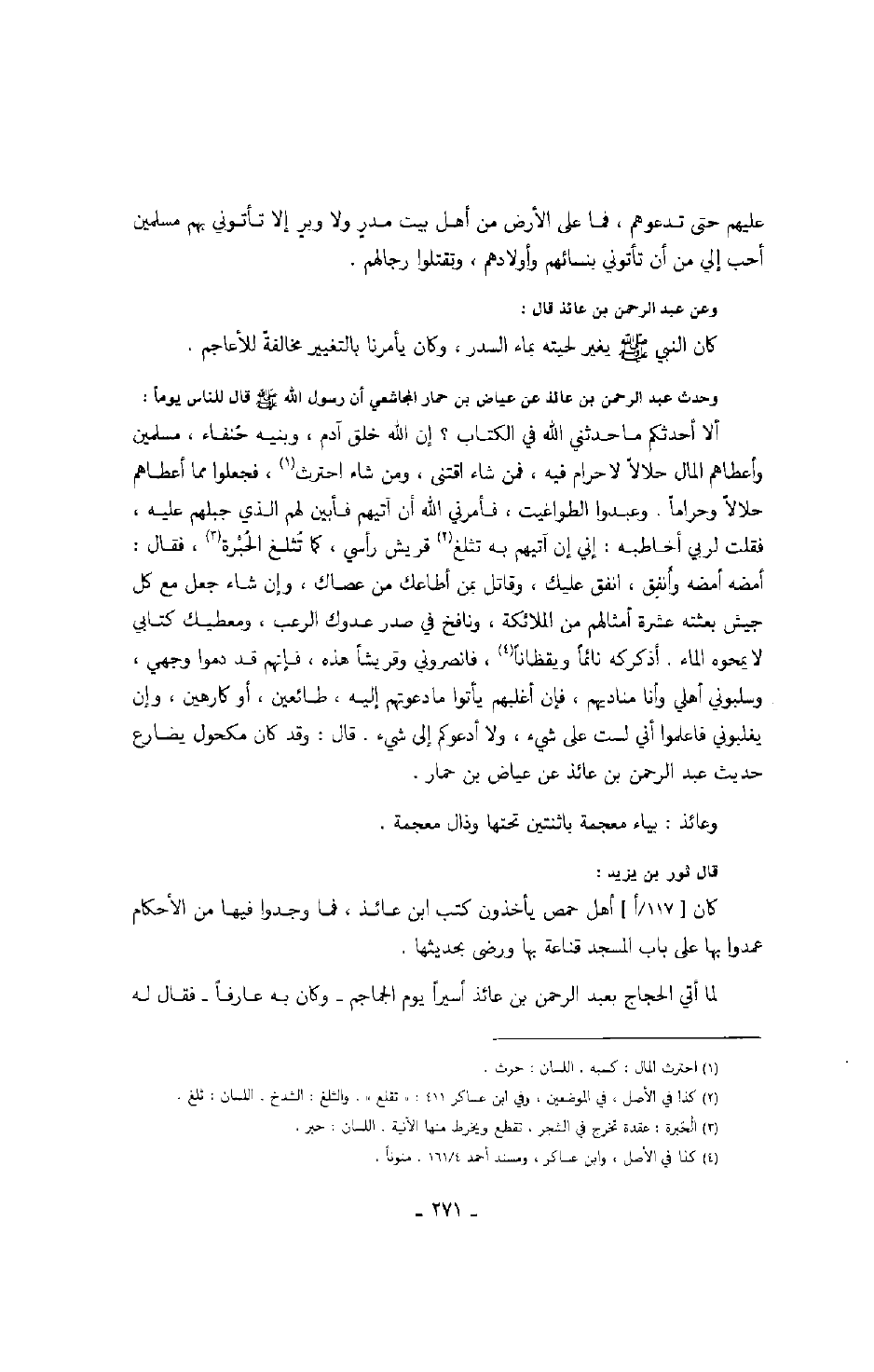 وحدث عبد الرحمن بن عائذ عن عياض بن حمار المجاشعي أن رسول الله صَلَّى اللهُ عَلَيْهِ وَسَلَّمَ قال للناس يوماً: ألا أحدثكم ما حدثني الله في الكتاب؟ إن الله خلق آدم، وبنيه حنفاء، مسلمين وأعطاهم المال حلالاً لا حرام فيه، فمن شاء اقتنى، ومن شاء احترث، فجعلوا مما أعطاهم حلالا وحراماً. وعبدوا الطواغيت، فأمرني الله أن آتيهم فأبين لهم الذي جبلهم عليه، فقلت لربي أخاطبه: إني إن آتيهم به تثلغ قريش رأسي، كما تثلغ الحبرة، فقال: أمضه أمضه وأنفق، انفق عليك، وقاتل بما أطاعك من عصاك، وإن شاء جعل مع كل جيش بعثته عشرة أمثالهم من الملائكة، ونافخ في صدر عدوك الرعب، ومعطيك كتابي لا يمحوه الماء. أذكركه نائماً ويقظاناً، فانصروني وقريشاً هذه، فإنهم قد دموا وجهي، وسلبوني أهلي وأنا مناديهم، فإن أغلبهم يأتوا ما دعوتهم إليه، طائعين، أو كارهين، وإن يغلبوني فاعلموا أني لست على شيء، ولا أدعوكم إلى شيء. قال: وقد كان مكحول يضارع حديث عبد الرحمن بن عائذ عن عياض بن حمار.