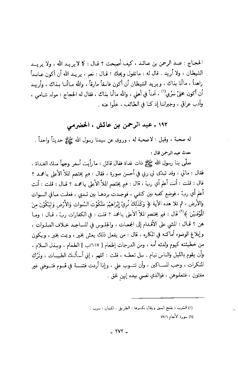 حدث عبد الرحمن قال: صلى بنا رسول الله صَلَّى اللهُ عَلَيْهِ وَسَلَّمَ ذات غداة فقال قائل: ما رأيت أسفر وجهاً منك الغداة، فقال: ما لي، وقد تبدى لي ربي في أحسن صورة، فقال: فيم يختصم الملأ الأعلى يا محمد؟ قال: قلت: أنت أعلم أي رب، قال: فيم يختصم الملأ الأعلى يا محمد؟ قال: قلت: أنت أعلم أي رب، فوضع كفه بين كتفي، فوجدت بردها بين ثديي، فعلمت ما في السموات والأرض، ثم تلا هذه الآية " وكذلك نري إبراهيم ملكوت السموات والأرض وليكون من الموقنين " قال: فيم يختصم الملأ الأعلى يا محمد؟ قلت: في الكفارات رب، قال: وما هن؟ قال: المشي على الأقدام إلى الجمعات، والجلوس في المساجد خلاف الصلوات، وإبلاغ الوضوء أماكنه في المكاره، قال: من يفعل ذلك يعش بخير، ويمت بخير، ويكون من خطيئته كيوم ولدته أمه، ومن الدرجات إطعام الطعام، وبذل السلام، وأن يقوم بالليل والناس نيام. سل تعطه، قلت: اللهم، إني أسألك الطيبات، وترك المنكرات، وحب المساكين، وأن تتوب علي، وإذا أردت فتنة في قوم فتوفني غير مفتون، فتعلموهن، فوالذي نفسي بيده إنه لحق.