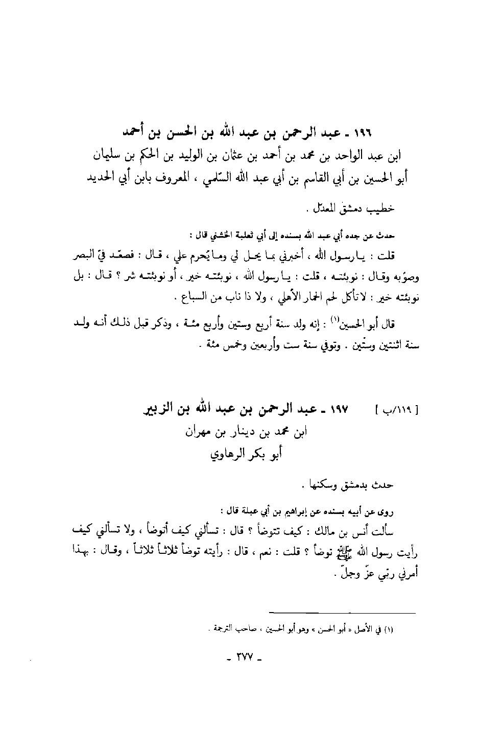 حدث عن جده أبي عبد الله بسنده إلى ابي ثعلبة الخشني قال: قلت: يا رسول الله، أخبرني بما يحل لي وما يحرم علي، قال: فصعد في البصر وصوبه وقال: نوبئته، قلت: يا رسول الله، نوبئته خير، أو نوبئته شر؟ قال: بل نوبئته خير: لا تأكل لحم الحمار الأهلي، ولا ذا ناب من السباع.