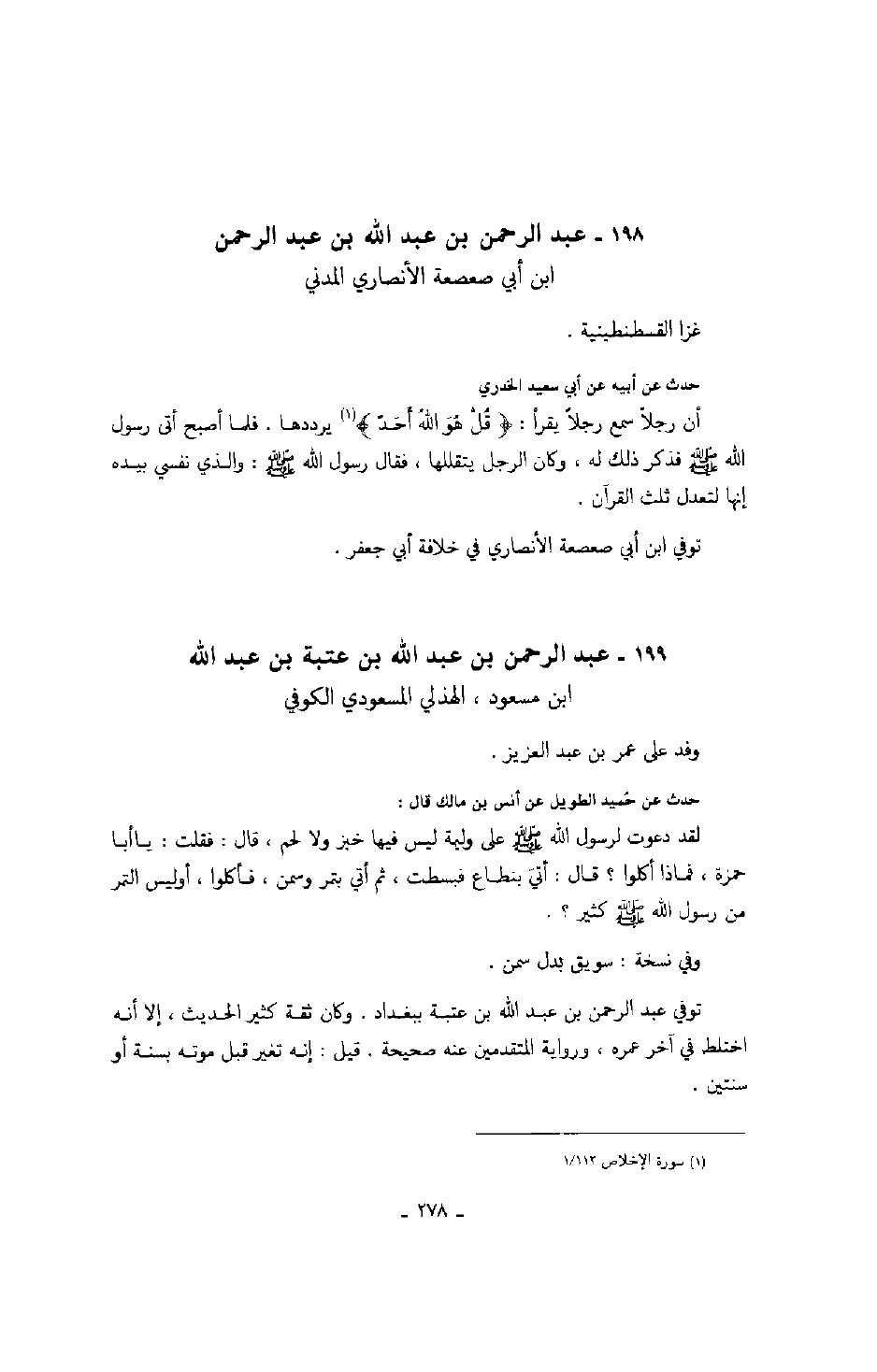 حدث عن أبيه عن أبي سعيد الخدري أن رجلاً سمع رجلاً يقرأ: " قل هو الله أحد " يرددها. فلما أصبح أتى رسول الله صَلَّى اللهُ عَلَيْهِ وَسَلَّمَ فذكر ذلك له، وكان الرجل يتقللها، فقال رسول الله صَلَّى اللهُ عَلَيْهِ وَسَلَّمَ: والذي نفسي بيده إنها لتعدل ثلث القرآن.