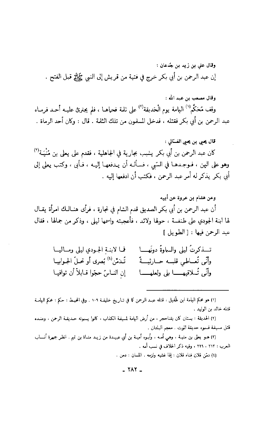 وعن هشام بن عروة عن أبيه أن عبد الرحمن بن أبي بكر الصديق قدم الشام في تجارة، فرأى هنالك امرأة يقال لها ابنة الجودي على طنفسة، حولها ولائد، فأعجبته واسمها ليلى، وذكر من جمالها، فقال عبد الرحمن فيها: الطويل
