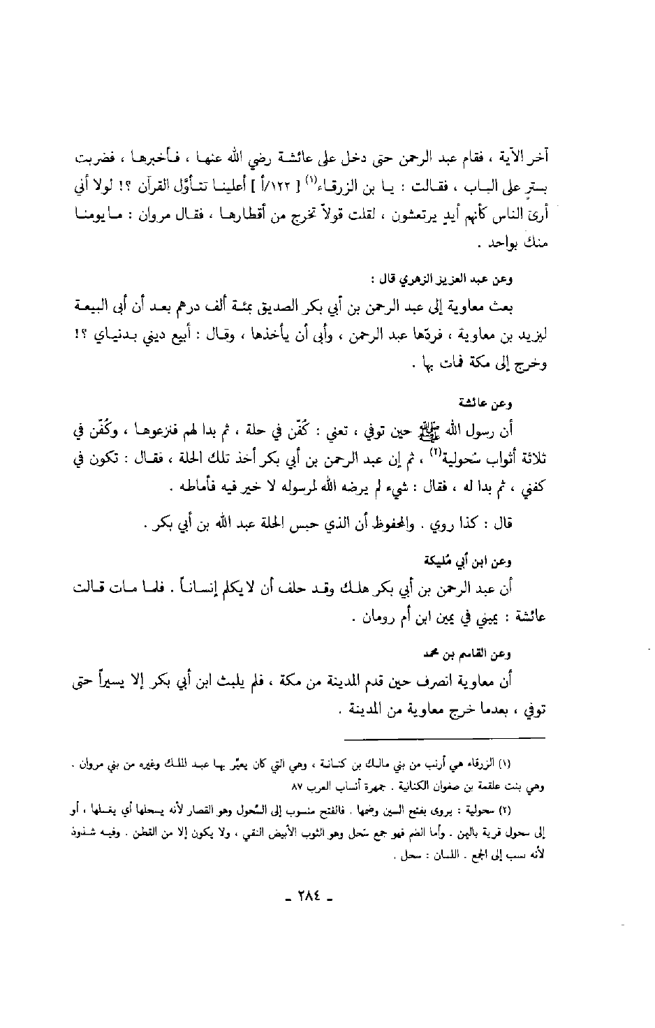آخر الآية، فقام عبد الرحمن حتى دخل على عائشة رضي الله عنها، فأخبرها، فضربت بسترٍ على الباب، فقالت: يا بن الزرقاء أعلينا تتأول القرآن؟! لولا أني أرى الناس كأنهم أيدٍ يرتعشون، لقلت قولاً تخرج من أقطارها، فقال مروان: ما يومنا منك بواحد.