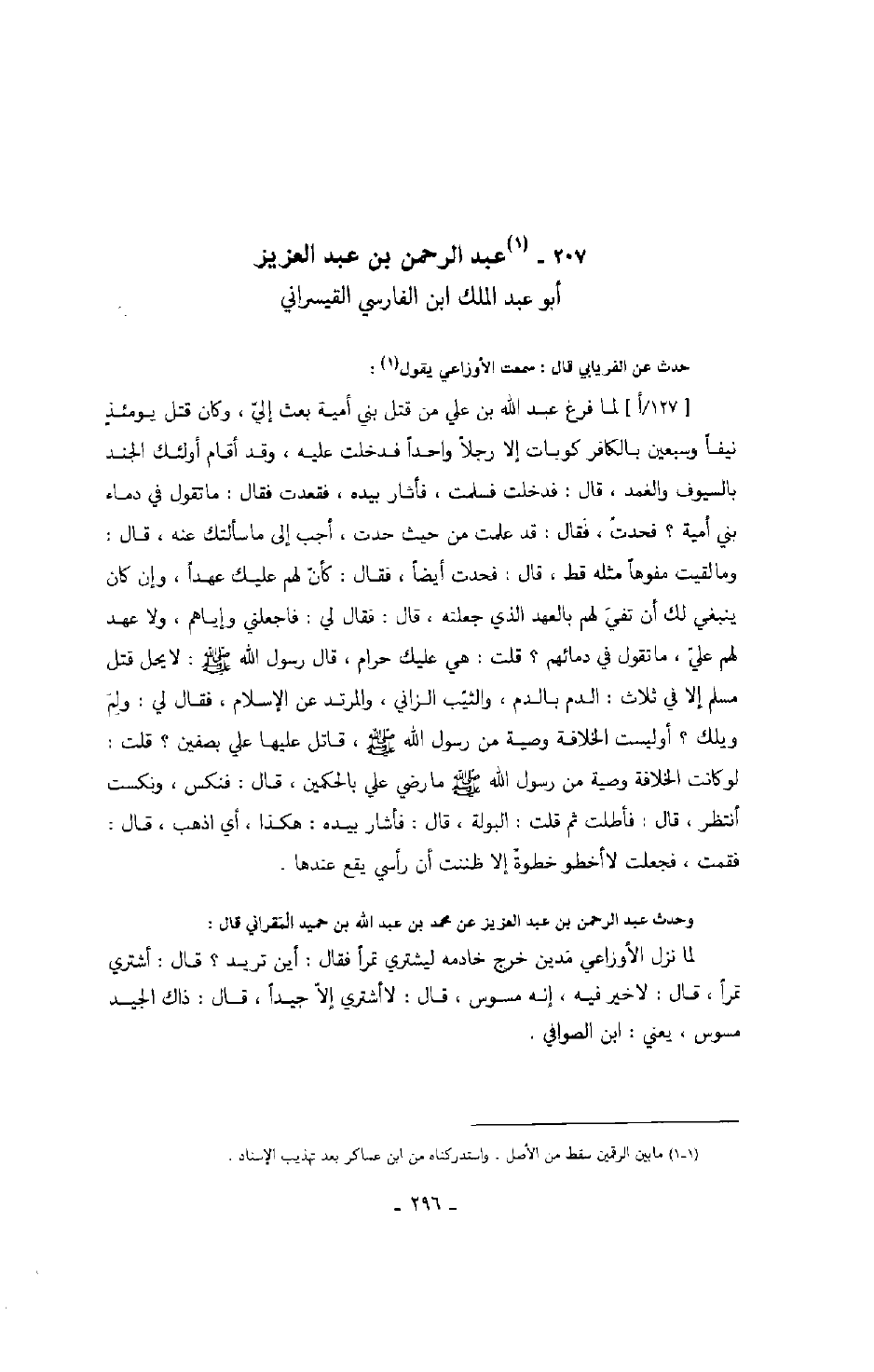 أبو عبد الملك ابن الفارسي القيسراني حدث عن الفريابي قال: سمعت الأوزاعي يقول: لما فرغ عبد الله بن علي من قتل بني أمية بعث إلي، وكان قتل يومئذٍ نيفاً وسبعين بالكافر كوبات إلا رجلاً واحداً فدخلت عليه، وقد أقام أولئك الجند بالسيوف والغمد، قال: فدخلت فسلمت، فأشار بيده، فقعدت فقال: ما تقول في دماء بني أمية؟ فحدت، فقال: قد علمت من حيث حدت، أجب إلى ما سألتك عنه، قال: وما لقيت مفوهاً مثله قط، قال: فحدت أيضاً، فقال: كأن لهم عليك عهداً، وإن كان ينبغي لك أن تفي لهم بالعهد الذي جعلته، قال: فقال لي: فاجعلني وإياهم، ولا عهد لهم علي، ما تقول في دمائهم؟ قلت: هي عليك حرام، قال رسول الله صَلَّى اللهُ عَلَيْهِ وَسَلَّمَ: لا يحل قتل مسلم إلا في ثلاث: الدم بالدم، والثيب الزاني، والمرتد عن الإسلام، فقال لي: ولم ويلك؟ أوليست الخلافة وصية من رسول الله صَلَّى اللهُ عَلَيْهِ وَسَلَّمَ، قاتل عليها علي بصفين؟ قلت: لو كانت الخلافة وصية من رسول الله صَلَّى اللهُ عَلَيْهِ وَسَلَّمَ ما رضي علي بالحكمين، قال: فنكس، ونكست أنتظر، قال: فأطلت ثم قلت: البولة، قال: فأشار بيده: هكذا، أي اذهب، قال: فقمت، فجعلت لا أخطو خطوة إلا ظننت أن رأسي يقع عندها.