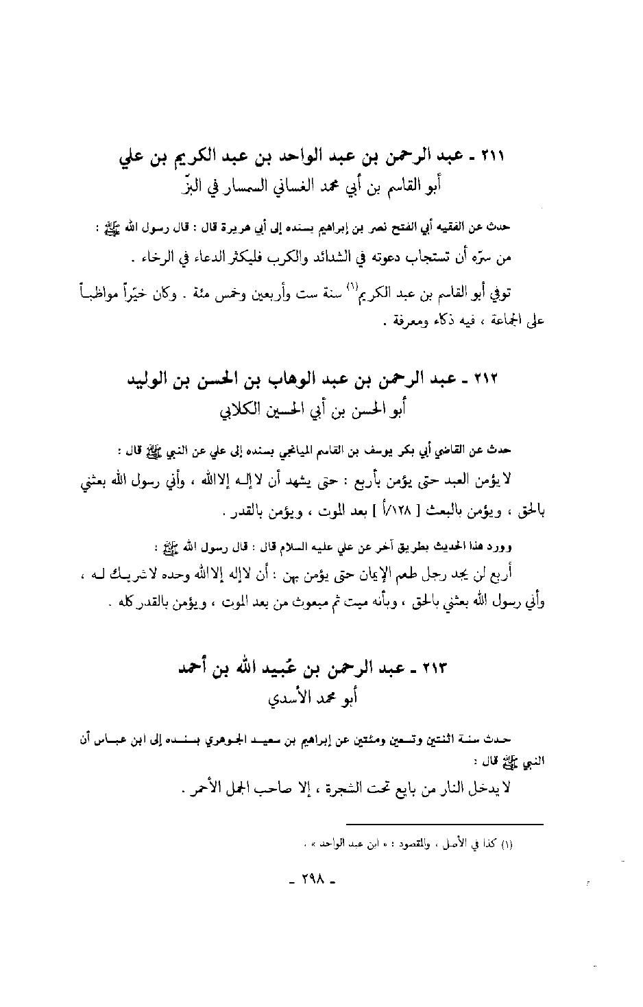 أبو الحسن بن أبي الحسين الكلابي حدث عن القاضي أبي بكر يوسف بن القاسم الميانجي بسنده إلى علي عن النبي صَلَّى اللهُ عَلَيْهِ وَسَلَّمَ قال: لا يؤمن العبد حتى يؤمن بأربع: حتى يشهد أن لا إله إلا الله، وأني رسول الله بعثني بالحق، ويؤمن بالبعث بعد الموت، ويؤمن بالقدر.