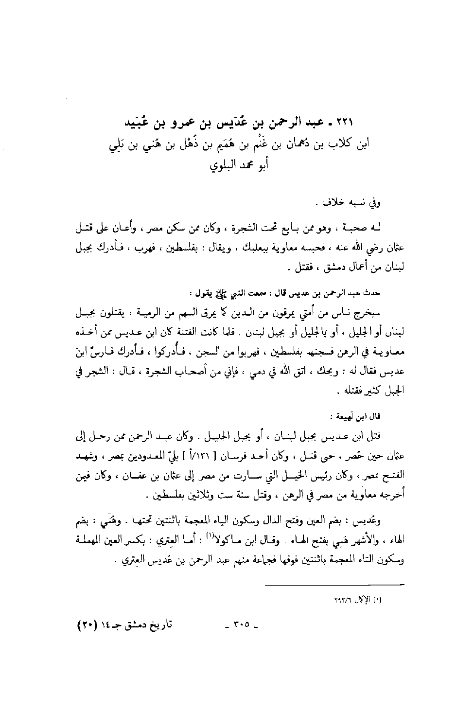 حدث عبد الرحمن بن عديس قال: سمعت النبي صَلَّى اللهُ عَلَيْهِ وَسَلَّمَ يقول: سيخرج ناس من أمتي يمرقون من الدين كما يمرق السهم من الرمية، يقتلون بجبل لبنان أو الجليل، أو بالجليل أو بجبل لبنان. فلما كانت الفتنة كان ابن عديس ممن أخذه معاوية في الرهن فسجنهم بفلسطين، فهربوا من السجن، فأدركوا، فأدرك فارس ابن عديس فقال له: ويحك، اتق الله في دمي، فإني من أصحاب الشجرة، قال: الشجر في الجبل كثير فقتله.