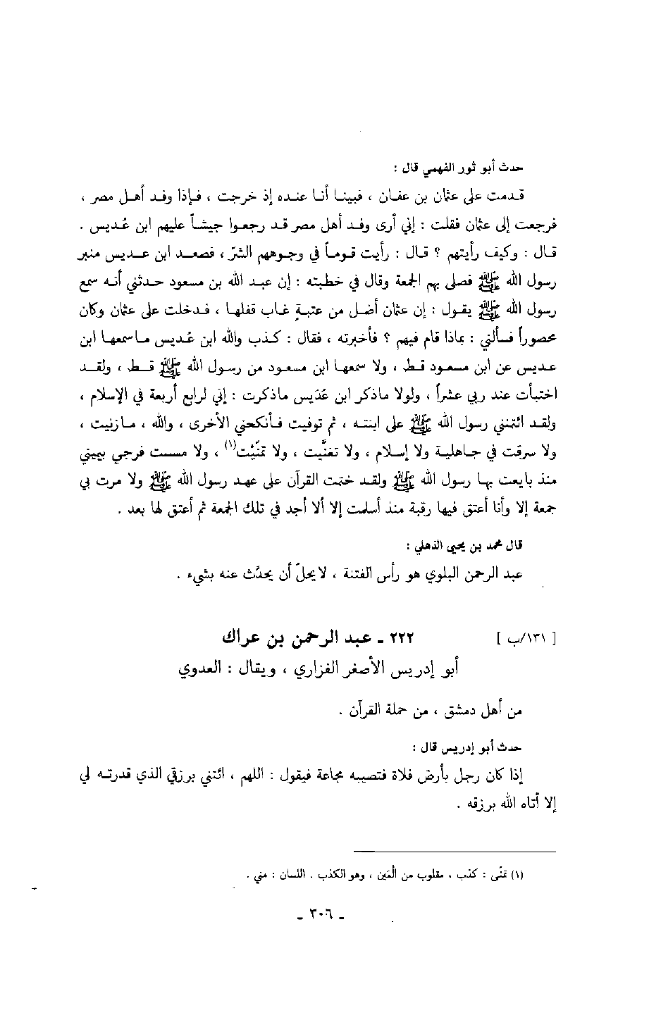 حدث أبو ثور الفهمي قال: قدمت على عثمان بن عفان، فبينا أنا عنده إذ خرجت، فإذا وفد أهل مصر، فرجعت إلى عثمان فقلت: إني أرى وفد أهل مصر قد رجعوا جيشاً عليهم ابن عديس. قال: وكيف رأيتهم؟ قال: رأيت قوماً في وجوههم الشر، فصعد ابن عديس منبر رسول الله صَلَّى اللهُ عَلَيْهِ وَسَلَّمَ فصلى بهم الجمعة وقال في خطبته: إن عبد الله بن مسعود حدثني أنه سمع رسول الله صَلَّى اللهُ عَلَيْهِ وَسَلَّمَ يقول: إن عثمان أضل من عتبة غاب قفلها، فدخلت على عثمان وكان محصوراً فسألني: بماذا قام فيهم؟ فأخبرته، فقال: كذب والله ابن عديس ما سمعها ابن عديس عن ابن مسعود قط، ولا سمعها ابن مسعود من رسول الله صَلَّى اللهُ عَلَيْهِ وَسَلَّمَ قط، ولقد اختبأت عند ربي عشراً، ولولا ما ذكر ابن عديس ما ذكرت: إني لرابع أربعة في الإسلام، ولقد ائتمنني رسول الله صَلَّى اللهُ عَلَيْهِ وَسَلَّمَ على ابنته، ثم توفيت فأنكحني الأخرى، والله، ما زنيت، ولا سرقت في جاهلية ولا إسلام، ولا تغنيت، ولا تمنيت، ولا مسست فرجي بيميني منذ بايعت بها رسول الله صَلَّى اللهُ عَلَيْهِ وَسَلَّمَ ولقد ختمت القرآن على عهد رسول الله صَلَّى اللهُ عَلَيْهِ وَسَلَّمَ ولا مرت بي جمعة إلا وأنا عتق فيها رقبة منذ أسلمت إلا ألا أجد في تلك الجمعة ثم أعتق لها بعد.