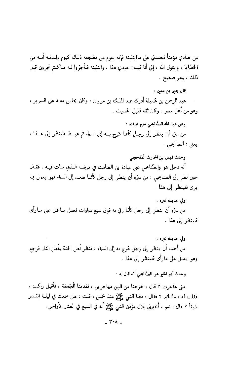 وعن عبد الله الصنابحي سمع عبادة: من سره أن ينظر إلى رجل كأنما عرج به إلى السماء ثم هبط فلينظر إلى هذا، يعني: الصنابحي.