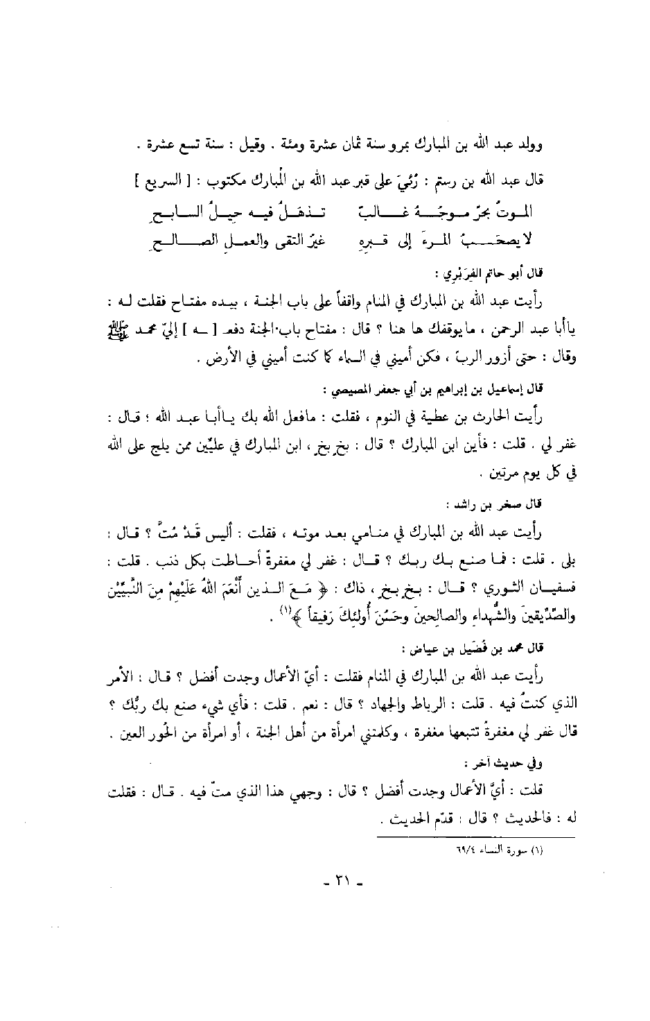 قال محمد بن فضيل بن عياض: رأيت عبد الله بن المبارك في المنام فقلت: أي الأعمال وجدت أفضل؟ قال: الأمر الذي كنت فيه. قلت: الرباط والجهاد؟ قال: نعم. قلت: فأي شيء صنع بك ربك؟ قال غفر لي مغفرة تتبعها مغفرة، وكلمتني امرأة من أهل الجنة، أو امرأة من الحور العين.