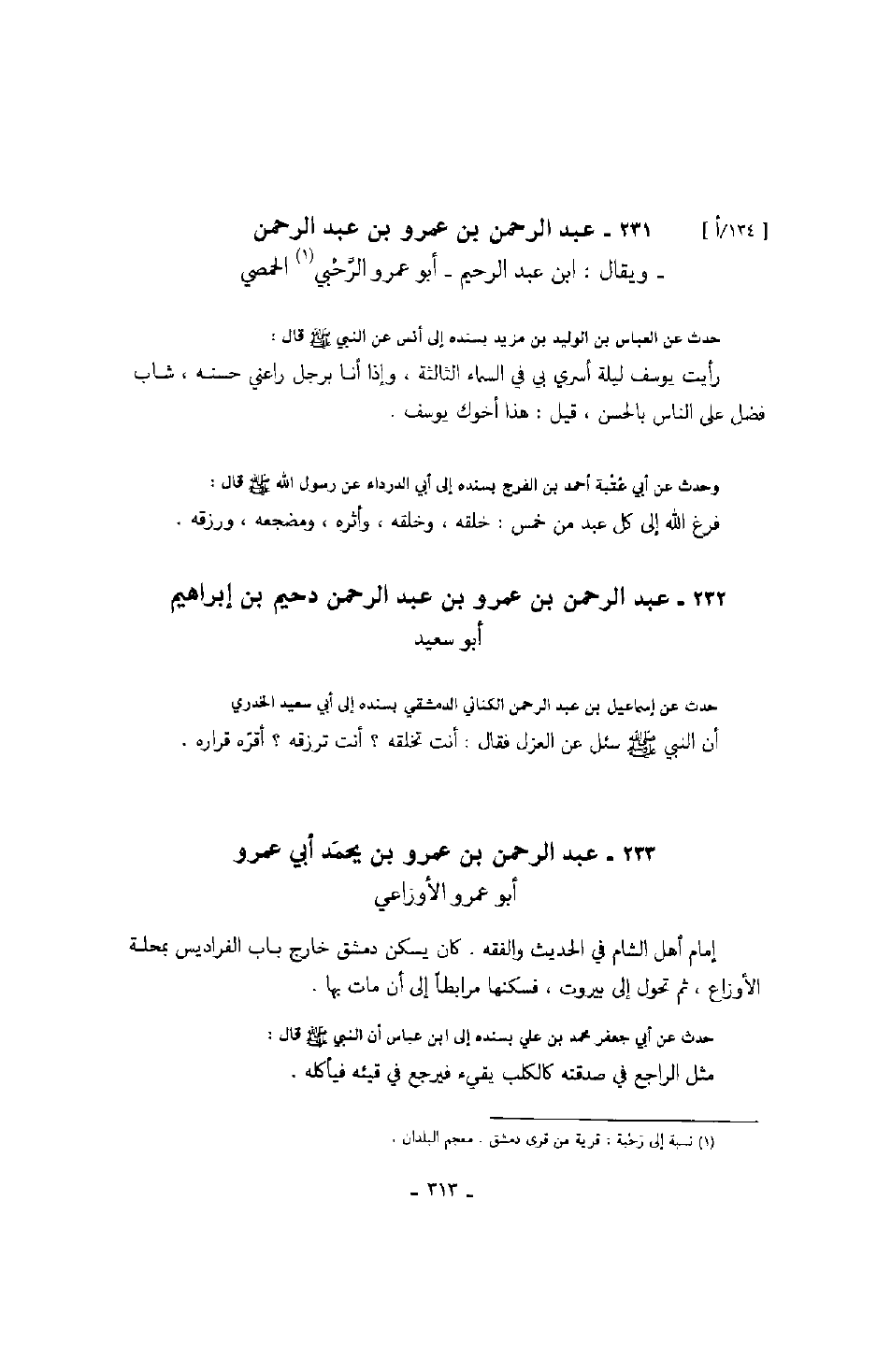 ويقال: ابن عبد الرحيم - أبو عمرو الرحبي الحمصي حدث عن العباس بن الوليد بن مزيد بسنده إلى أنس عن النبي صَلَّى اللهُ عَلَيْهِ وَسَلَّمَ قال: رأيت يوسف ليلة أسري بي في السماء الثالثة، وإذا أنا برجل راعني حسنه، شاب فضل على الناس بالحسن، قيل: هذا أخوك يوسف.