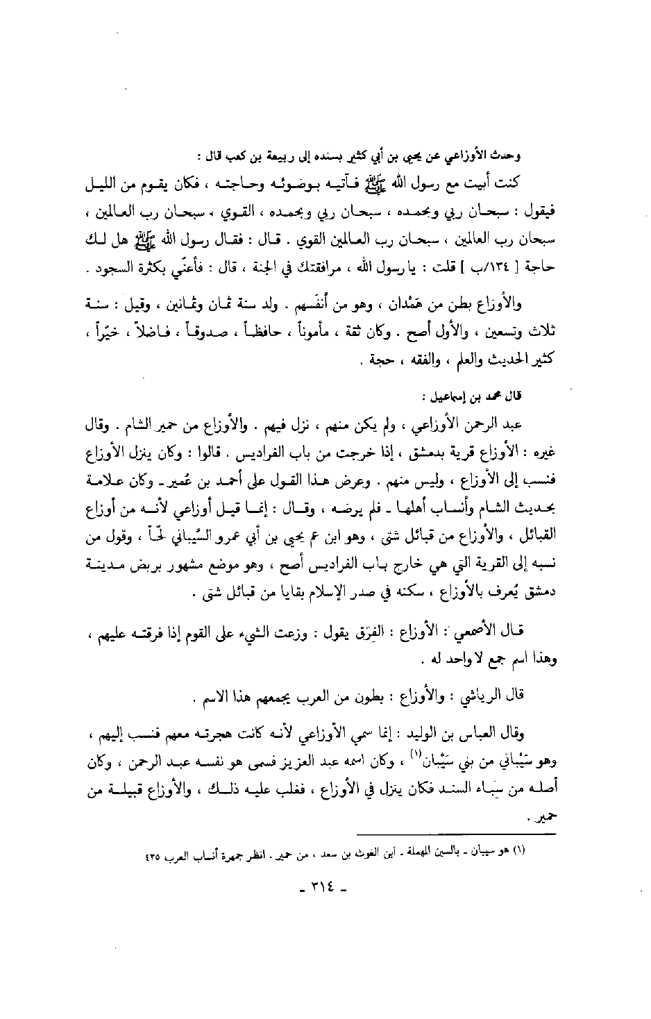 عبد الرحمن الأوزاعي، ولم يكن منهم، نزل فيهم، والأوزاع من حمير الشام. وقال غيره: الأوزاع قرية بدمشق، إذا خرجت من باب الفراديس. قالوا: وكان ينزل الأوزاع فنسب إلى الأوزاع، وليس منهم. وعرض هذا القول على أحمد بن عمير - وكان علامة بحديث الشام وأنساب أهلها - فلم يرضه، وقال: إنما قيل أوزاعي لأنه من أوزاع القبائل، والأوزاع من قبائل شتى، وهو ابن عم يحيى بن أبي عمرو السيباني لحاً، وقول من نسبه إلى القرية التي هي خارج باب الفراديس أصح، وهو موضع مشهور بربض مدينة دمشق يعرف بالأوزاع، سكنه في صدر الإسلام بقايا من قبائل شتى.