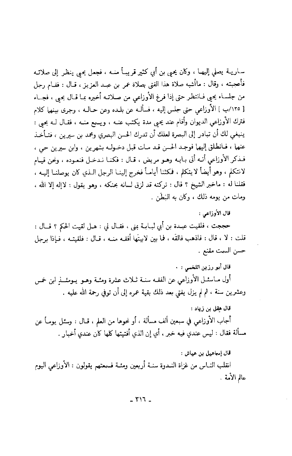 سارية يصلي إليها، وكان يحيى بن أبي كثير قريباً منه، فجعل يحيى ينظر إلى صَلَّى اللهُ عَلَيْهِ وَسَلَّمَى الله عليه وسلمى الله عليه وسلماته فأعجبته، وقال: ما أشبه صَلَّى اللهُ عَلَيْهِ وَسَلَّمَى الله عليه وسلمى الله عليه وسلماة هذا لافتى بصَلَّى اللهُ عَلَيْهِ وَسَلَّمَى الله عليه وسلمى الله عليه وسلماة عمر بن عبد العزيز، قال: فقام رجل من جلساء يحيى فانتظر حتى إذا فرغ الأوزاعي من صَلَّى اللهُ عَلَيْهِ وَسَلَّمَى الله عليه وسلمى الله عليه وسلماته أخيبره بما قال يحيى، فجاء الأوزاعي الديوان وأقام عند يحيى مدة يكتب عنه، ويمسع منه، فقال له يحي: ينبغي لك أن تبادر إلى البصرة لعلك أن تدرك الحسن البصري ومحمد بن سيرين، فتأخذ عنهما، فانطلق إليهما فوجد الحسن قد مات قبل دخوله بشهرين، وابن سيرين حي، فذكر الأوزاعي أنه أتى بابه وهو مريض، قال: فكنا ندخل فنعوده، ونحن قيام لا نتكلم، وهو أيضاً لا يتكلم، فمكثنا أياماً فخرج إلينا الرجل الذي كان يوصَلَّى اللهُ عَلَيْهِ وَسَلَّمَى الله عليه وسلمى الله عليه وسلمنا إليه، فقلنا له: ما خبر الشيخ؟ قال: تركته قد لزق لسانه بحنكه، وهو يقول: لا إله إلا الله، ومات من يومه ذلك، وكان به البطن.