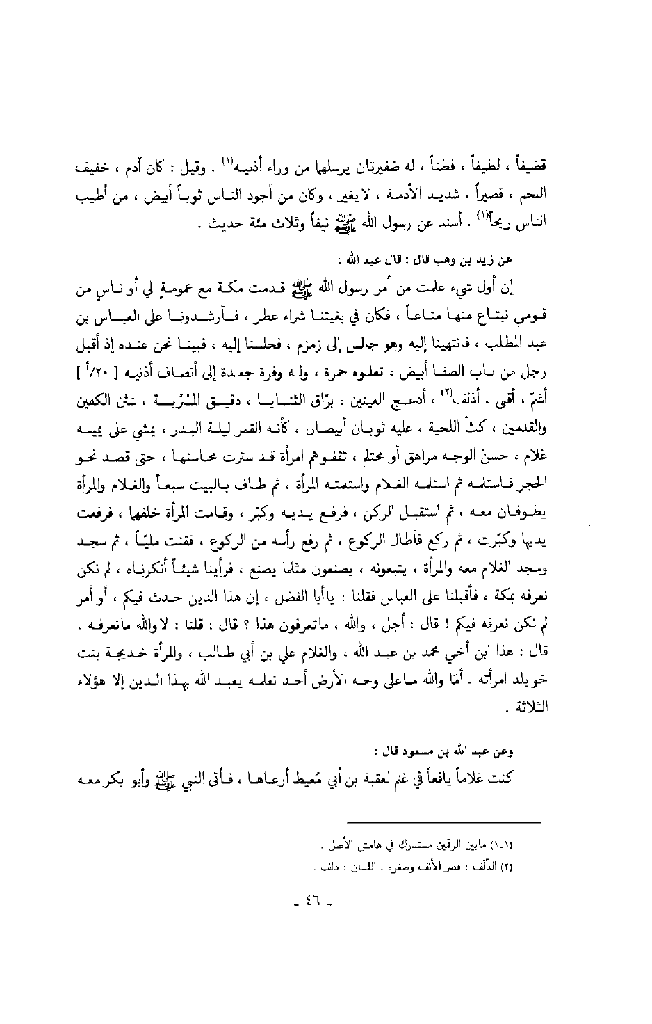 عن زيد من بن وهب قال قال عبد الله إن أول شيء علمت من أمر رسول الله صَلَّى اللهُ عَلَيْهِ وَسَلَّمَ قدمت مكة مع عمومةٍ لي أو ناسٍ من قومي نبتاع منها متاعاً، فكان في بغيتنا شراء عطر، فأرشدونا على العباس بن عبد المطلب، فانتهينا إليه وهو جالس إلى زمزم، فجلسنا إليه، فبينا نحن عنده إذ أقبل رجل من باب الصفا أبيض، تعلوه حمرة، وله وفرة جعدة إلى أنصاف أذنيه أشتم، أقنى، أذلف، أدعج العينين، براق الثنايا، دقيق المسربة، شثن الكفين والقدمين، كث اللحية، عليه ثوبان أبيضان، كأنه القمر ليلة البدر، يمشي على يمينه غلام، حسن الوجه مراهق أو محتلم، تقفوهم امرأة قد سترت محاسنها، حتى قصد نحو الحجر فاستلمه ثم استلمه الغلام واستلمته المرأة، ثم طاف بالبيت سبعاً والغلام والمرأة يطوفان معه، ثم استقبل الركن، فرفع يديه وكبر، وقامت المرأة خلفهما، فرفعت يديها وكبرت، ثم ركع فأطال الركوع، ثم رفع رأسه من الركوع، فقنت ملياً، ثم سجد وسجد الغلام معه والمرأة، يتبعونه، يصنعون مثلما يصنع، فرأينا شيئاً أنكرناه، لم نكن نعرفه بمكة، فأقبلنا على العباس فقلنا: يا أبا الفضل، إن هذا الدين حدث فيكم، أو أمر لم نكن نعرفه فيكم! قال: أجل، والله، ما تعرفون هذا؟ قال: قلنا: لا والله ما نعرفه. قال: هذا ابن أخي محمد بن عبد الله، والغلام علي بن أبي طالب، والمرأة خديجة بنت خويلد امرأته. أما والله ما على وجه الأرض أحد نعلمه يعبد الله بهذا الدين إلا هؤلاء الثلاثة.