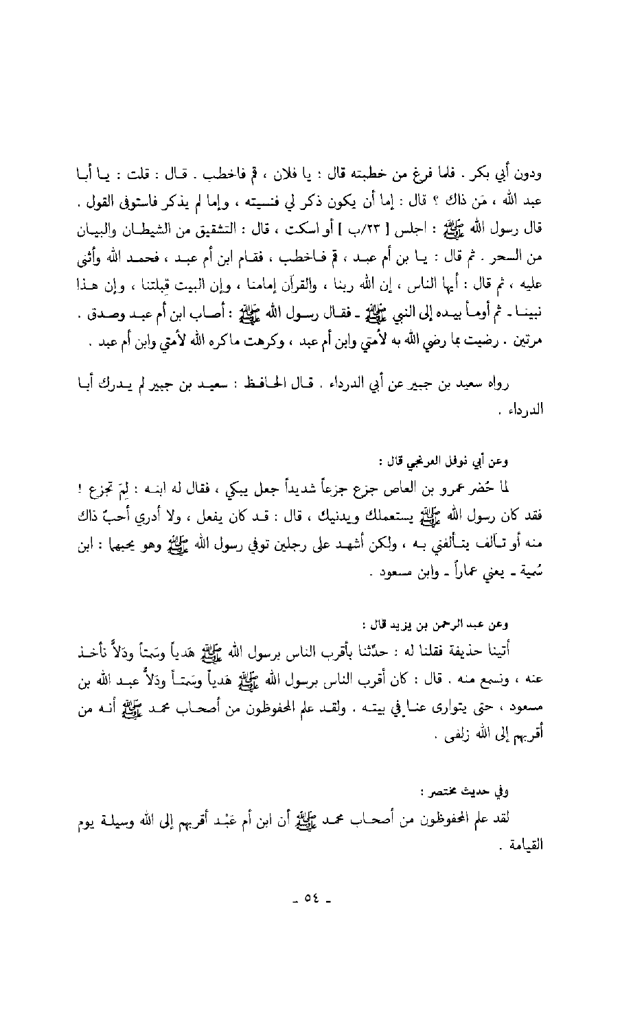 ودون أبي بكر. فلما فرغ من خطبته قال: يا فلان، قم فاخطب. قال: قلت: يا أبا عبد الله، من ذاك؟ قال: إما أن يكون ذكر لي فنسيته، وإما لم يذكر فاستوفى القول. قال رسول الله صَلَّى اللهُ عَلَيْهِ وَسَلَّمَ: اجلس أو اسكت، قال: التشقيق من الشيطان والبيان من السحر. ثم قال: يا بن أم عبد، قم فاخطب، فقام ابن أم عبد، فحمد الله وأثنى عليه، ثم قال: أيها الناس، إن الله ربنا، والقرآن إمامنا، وإن البيت قبلتنا، وإن هذا نبينا - ثم أومأ بيده إلى النبي صَلَّى اللهُ عَلَيْهِ وَسَلَّمَ - فقال رسول الله صَلَّى اللهُ عَلَيْهِ وَسَلَّمَ: أصاب ابن أم عبد وصدق. مرتين. رضيت بما رضي الله به لأمتي وابن أم عبد، وكرهت ما كره الله لأمتي وابن أم عبد.