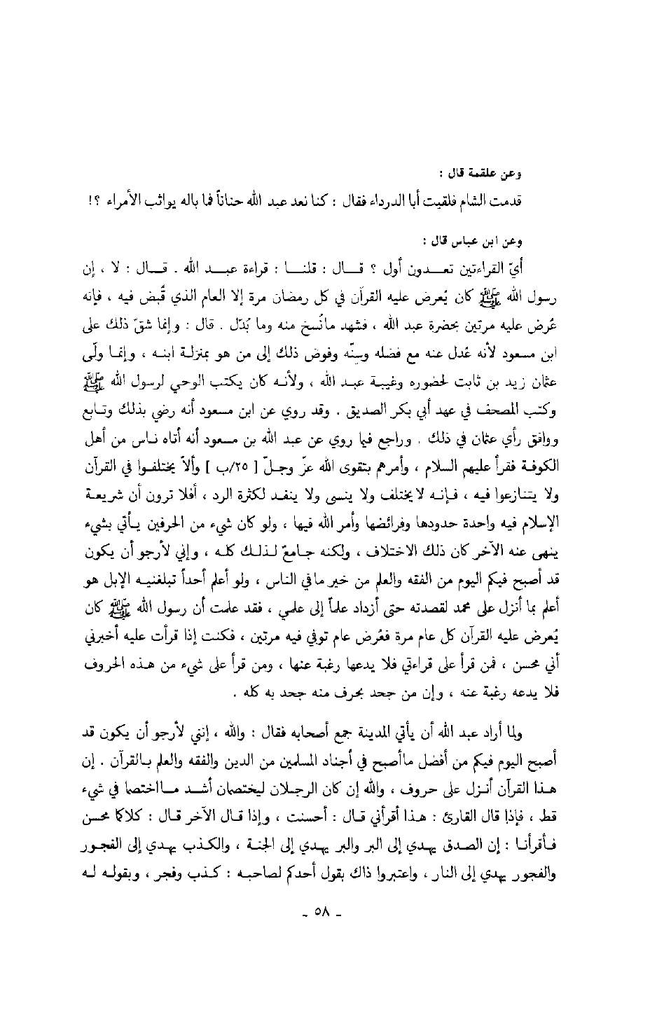 وعن علقمة قال: قدمت الشام فلقيت أبا الدرداء فقال: كنا نعد عبد الله حناناً فما باله يواثب الأمراء؟! وعن ابن عباس قال: أي القراءتين تعدون أول؟ قال: قلنا: قراءة عبد الله. قال: لا، إن رسول الله صَلَّى اللهُ عَلَيْهِ وَسَلَّمَ كان يعرض عليه القرآن في كل رمضان مرة إلا العام الذي قبض فيه، فإنه عرض عليه مرتين بحضرة عبد الله، فشهد ما نسخ منه وما بدل. قال: وإنما شق ذلك على ابن مسعود لأنه عدل عنه مع فضله وسنه وفوض ذلك إلى من هو بمنزلة ابنه، وإنما ولى عثمان زيد بن ثابت لحضوره وغيبة عبد الله، ولأنه كان يكتب الوحي لرسول الله صَلَّى اللهُ عَلَيْهِ وَسَلَّمَ وكتب المصحف في عهد أبي بكر الصديق. وقد روي عن ابن مسعود أنه رضي بذلك وتابع ووافق رأي عثمان في ذلك. وراجع فيما روي عن عبد الله بن مسعود أنه أتاه ناس من أهل الكوفة فقرأ عليهم السلام، وأمرهم بتقوى الله عز وجل وألا يختلفوا في القرآن ولا يتنازعوا فيه، فإنه لا يختلف ولا ينسى ولا ينفذ لكثرة الرد، أفلا ترون أن شريعة الإسلام فيه واحدة حدودها وفرائضها وأمر الله فيها، ولو كان شيء من الحرفين يأتي بشيء ينهى عنه الآخر كان ذلك الاختلاف، ولكنه جامع لذلك كله، وإني لأرجو أن يكون قد اصبح فيكم اليوم من الفقه والعلم من خير ما في الناس، ولو أعلم أحداً تبلغنيه الإبل هو أعلم بما أنزل على لقصدته حتى أزداد علماً إلى علمي، فقد علمت أن رسول الله صَلَّى اللهُ عَلَيْهِ وَسَلَّمَ كان يعرض عليه القرآن كل عام مرة فعرض عام توفي فيه مرتين، فكنت إذا قرأت عليه أخبرني أني محسن، فمن قرأ على قراءتي فلا يدعها رغبة عنها، ومن قرأ على شيء من هذه الحروف فلا يدعه رغبة عنه، وإن من جحد بحرف منه حجد به كله.