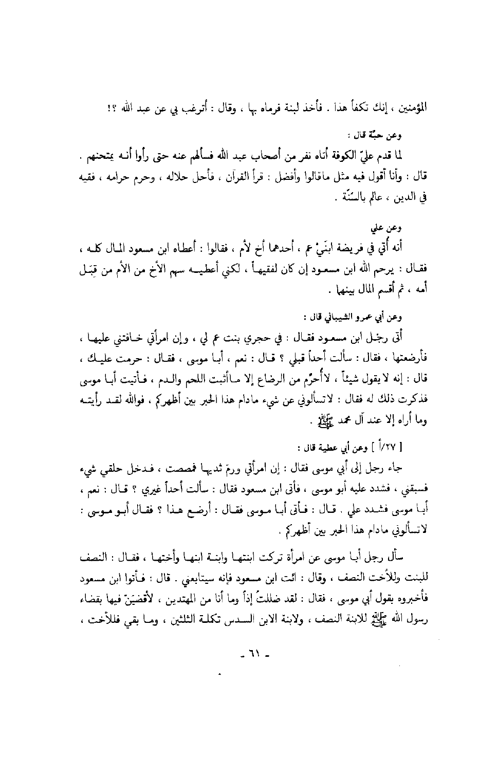 سأل رجل أبا موسى عن امرأة تركت ابنتها وابنة ابنها وأختها، فقال: النصف للبنت وللأخت النصف، وقال: ائت ابن مسعود فإنه سيتابعني. قال: فأتوا ابن مسعود فأخبروه بقول أبي موسى، فقال: لقد ضللت إذاً وما أنا من المهتدين، لأقضين فيها بقضاء رسول الله صَلَّى اللهُ عَلَيْهِ وَسَلَّمَ للابنة النصف، ولا بن الابن السدس الكلمة الثلثين، وما بقي فللأخت،