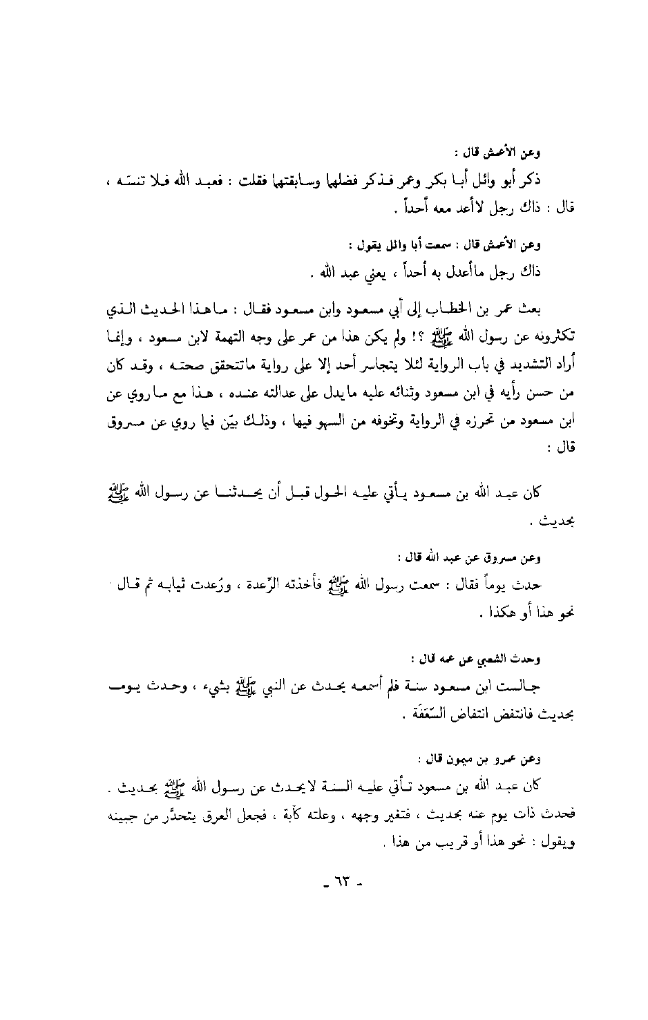 وعن عمرو بن ميمون قال: كان عبد الله بن مسعود تأتي عليه السنة لا يحدث عن رسول الله صَلَّى اللهُ عَلَيْهِ وَسَلَّمَ بحديث.