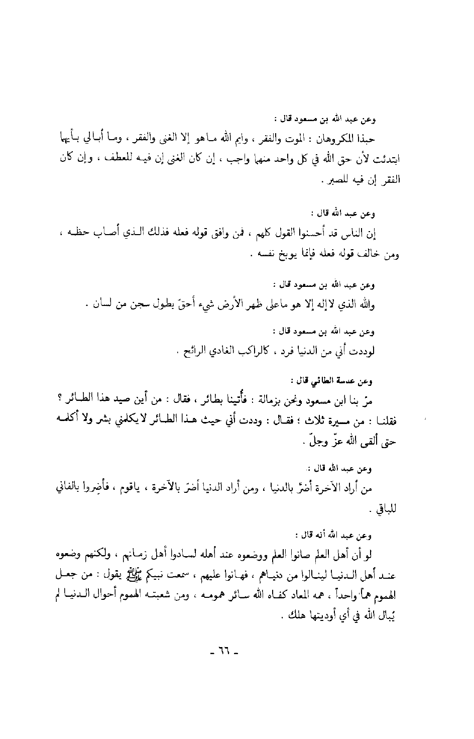 وعن عدسة الطائي قال: مر بنا ابن مسعود ونحن بزمالة: فأتينا بطائر، فقال: من أين صيد هذا الطائر؟ فقلنا: من مسيرة ثلاث؛ فقال: وددت أني حيث هذا الطائر لا يكلمني بشر ولا أكلمه حتى ألقى الله عز وجل.