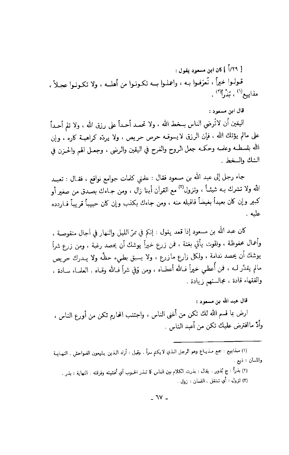 كان ابن مسعود يقول: قولوا خيراً، تعرفوا به، واعملوا به تكونوا من أهله، ولا تكونوا عجلاً، مذاييع، بذراً.