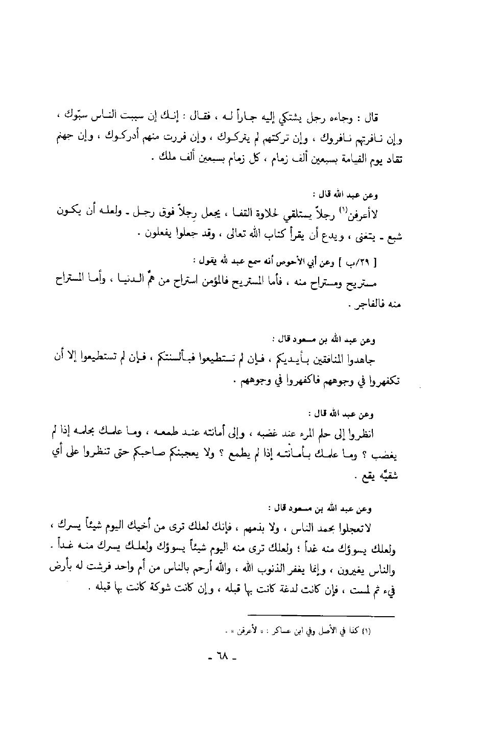 وعن عبد الله قال: لا أعرفن رجلاً يستلقي لحلاوة القفا، يجعل رجلاً فوق رجل - ولعله أن يكون شبع - يتغنى، ويدع أن يقرأ كتاب الله تعالى، وقد جعلوا يفعلون.