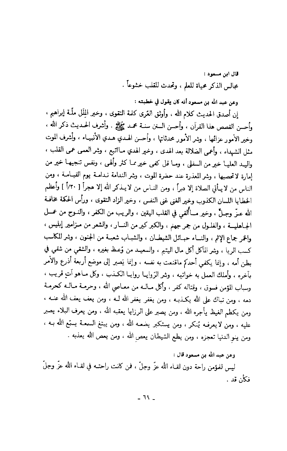 وعن عبد الله بن مسعود أنه كان يقول في خطبته: إن أصدق الحديث كلام الله، وأثق العرى كلمة التقوى، وخير الملل ملة إبراهيم، وأحسن القصص هذا القرآن، وأحسن السنن سنة محمد صَلَّى اللهُ عَلَيْهِ وَسَلَّمَ. وأشرف الحديث ذكر الله، وخير الأمور عزائمها، وشر الأمور محدثاتها، وأحسن الهدي هدي الأنبياء، وأشرف الموت مثل الشهداء، وأعمى الضلالة بعد الهدى، وخير الهدي ما اتبع، وشر العمى عمى القلب، واليد العليا خير من السفلى، وما قل كفى خير مما كثر وألهى، ونفس تنجيها خير من إمارة لا تحصيها، وشر المعذرة عند حضرة الموت، وشر الندامة ندامة يوم القيامة، ومن الناس من لا يأتي الصلاة إلا دبراً، ومن الناس من لا يذكر الله هجراً وأعظم الخطايا اللسان الكذوب وخير الغنى غنى النفس، وخير الزاد التقوى، ورأس الحكمة مخافة الله عز وجل، وخير ما ألقي في القلب اليقين، والريب من الكفر، والنوح من عمل الجاهلية، والغلول من جمر جهنم، والكبر كير من النار، والشعر من مزامير إبليس، والخمر جماع الإثم، والنساء حبائل الشيطان، والشباب شعبة من الجنون، وشر المكاسب كسب الربا، وشر المآكل أكل مال اليتيم، والسعيد من وعظ بغيره، والشقي من شقي في بطن أمه، وإنما يكفي أحدكم ما قنعت به نفسه، وإنما يصير إلى موضع أربعة أذرع والأمر بآخره، وأملك العمل به خواتيمه، وشر الروايا روايا الكذب، وكل ما هو آتٍ قريب، وسباب المؤمن فسوق، وقتاله كفر، وأكل ماله من معاصي الله، وحرمة ماله كحرمة دمه، ومن تباك على الله يكذبه، ومن يغفر يغفر الله له، ومن يعف يعف الله عنه، ومن يكظم الغيظ يأجره الله، ومن يصبر على الرزايا يعقبه الله، ومن يعرف البلاء يصبر عليه، ومن لا يعرفه ينكر، ومن يستكبر يضعه الله، ومن يبتغ السمعة يسمع الله به، ومن ينو الدنيا تعجزه، ومن يطع الشيطان يعص الله، ومن يعص الله يعذبه.