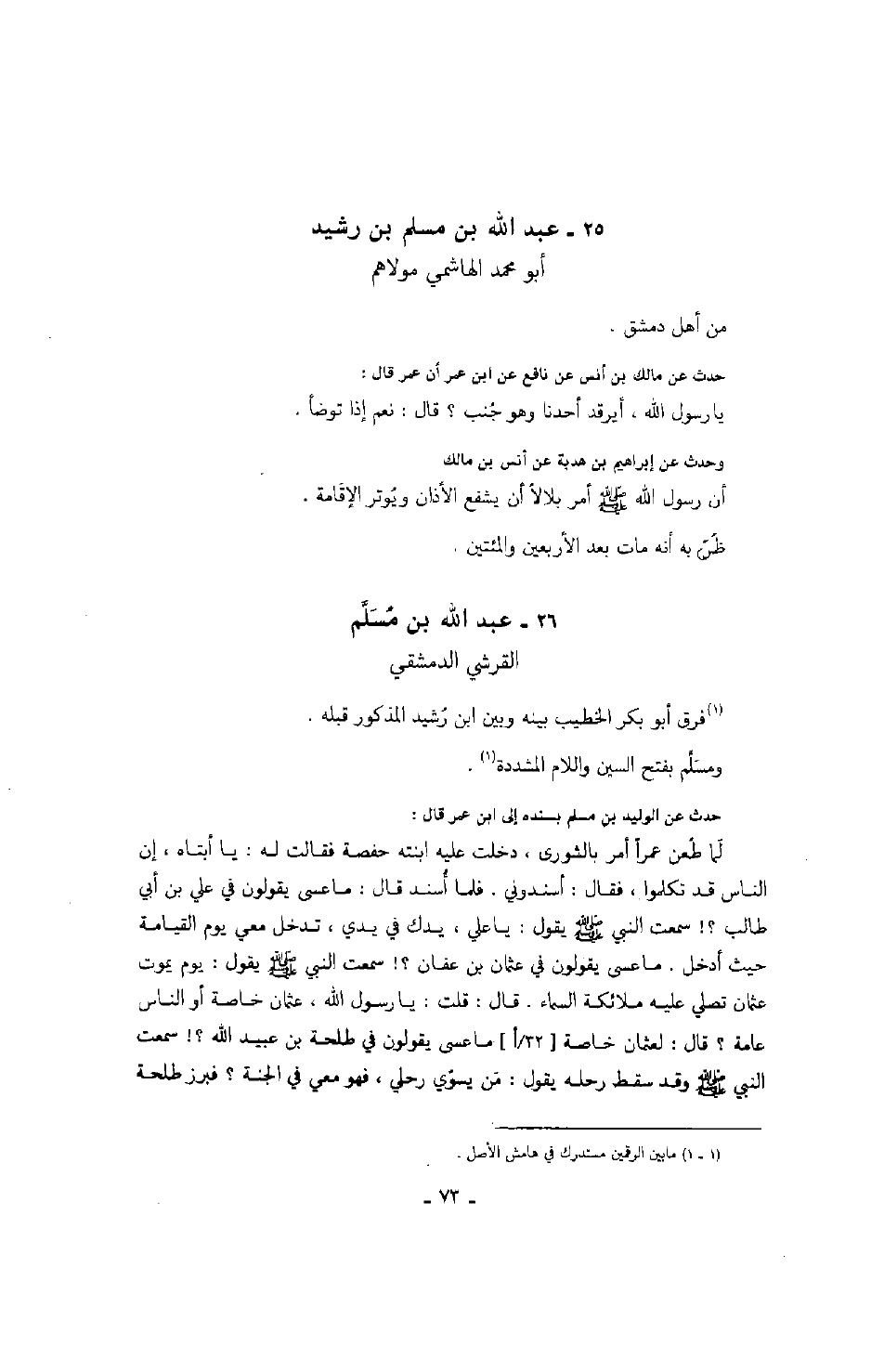 حدث عن الوليد بن مسلم بسنده إلى ابن عمر قال: لما طعن عمراً أمر بالشورى، دخلت عليه ابنته حفصة فقالت له: يا أبتاه، إن الناس قد تكلموا، فقال: أسندوني. فلما أسند قال: ما عسى يقولون في علي بن أبي طالب؟ سمعت النبي صَلَّى اللهُ عَلَيْهِ وَسَلَّمَ يقول: يا علي، يدك في يدي، تدخل معي يوم القيامة حيث أدخل. ما عسى يقولون في عثمان بن عفان؟! سمعت النبي صَلَّى اللهُ عَلَيْهِ وَسَلَّمَ يقول: يوم يموت عثمان تصلي عليه ملائكة السماء. قال: قلت: يا رسول الله، عثمان خاصة أو الناس عامة؟ قال: لعثمان خاصة ما عسى يقولون في طلحة بن عبيد الله؟! سمعت النبي صَلَّى اللهُ عَلَيْهِ وَسَلَّمَ وقد سقط رحله يقول: من يسوي رحلي، فهو معي في الجنة؟ فبرز طلحة