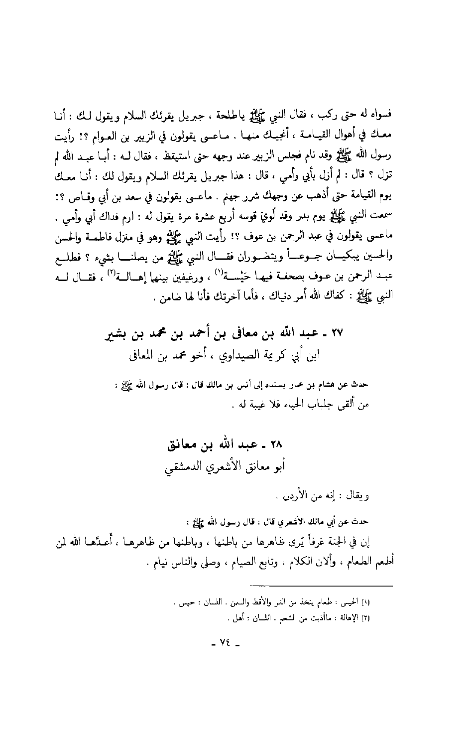 ابن محمد بن بشير بن أبي كريمة الصيداوي، أخو محمد بن المعافى حدث عن هشام بن عمار بسنده إلى أنس بن مالك قال: قال رسول الله صَلَّى اللهُ عَلَيْهِ وَسَلَّمَ: من ألقى جلباب الحياء فلا غيبة له.