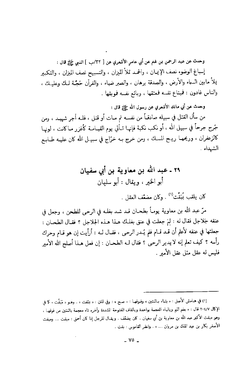 وحدث عن عبد الرحمن بن غنم عن أبي عامر الأشعري عن النبي صَلَّى اللهُ عَلَيْهِ وَسَلَّمَ قال: إسباغ الوضوء نصف الإيمان، والحمد تملأ الميزان، والتسبيح نصف الميزان، والتكبير يملأ ما بين السماء والأرض، والصدقة برهان، والصبر ضياء، والقرآن حجة لك وعليك، والناس غادون: فمبتاع نفسه فمعتقها، وبائع نفسه فموبقها.