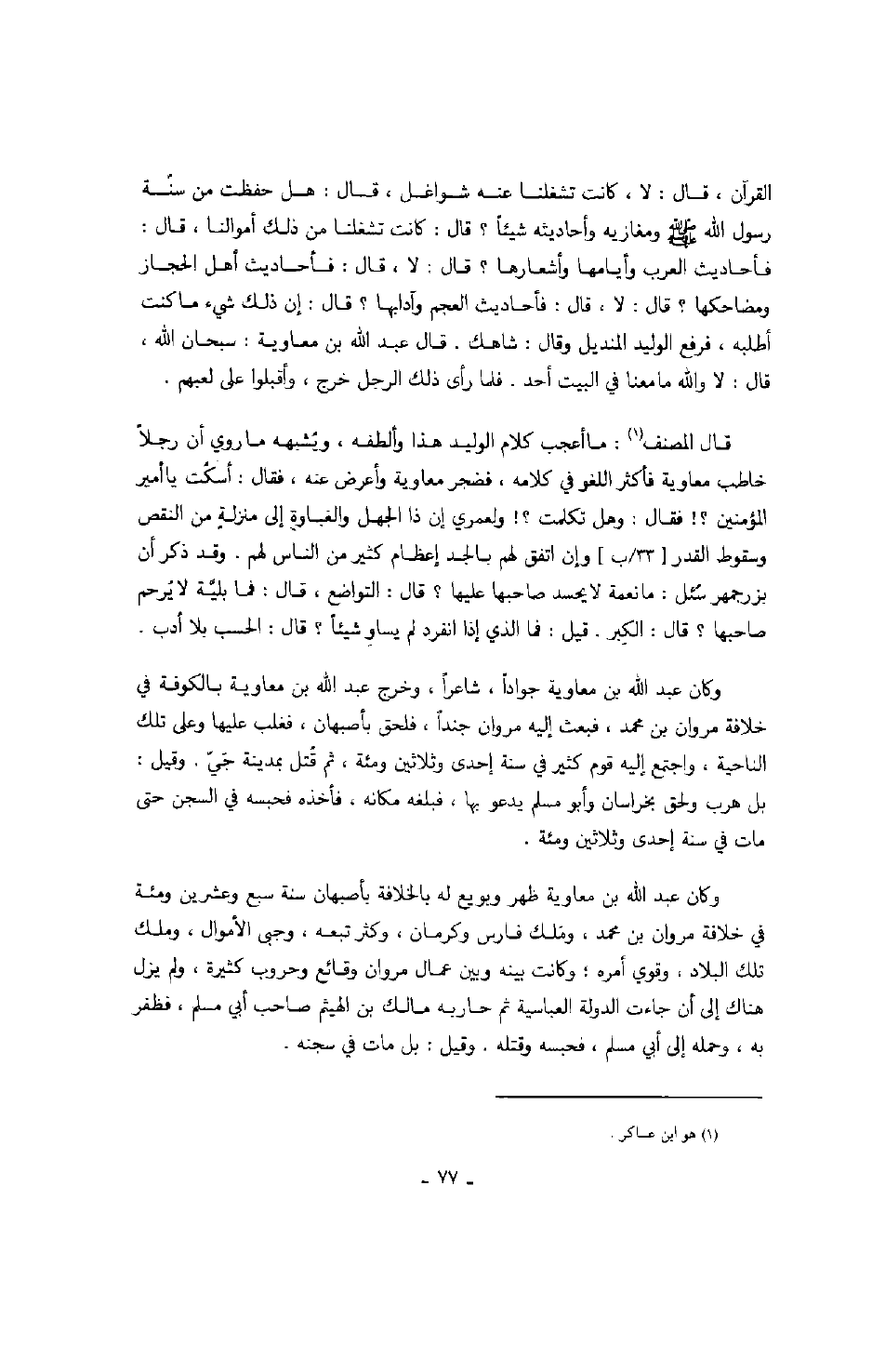 القرآن، قال: لا، كانت تشغلنا عنه شواغل، قال: هل حفظت من سنة رسول الله صَلَّى اللهُ عَلَيْهِ وَسَلَّمَ ومغازيه وأحاديثه شيئاً؟ قال: كانت تشغلنا من ذلك أموالنا، قال: فأحاديث العرب وايامها وأشعارها؟ قال: لا، قال: فأحاديث أهل الحجاز ومضاحكها؟ قال: لا، قال: فأحاديث العجم وآدابها؟ قال: إن ذلك شيء ما كنت أطلبه، فرفع الوليد المنديل وقال: شاهك. قال عبد الله بن معاوية: سبحان الله، قال: لا والله ما معنا في البيت أحد. فلما رأى ذلك الرجل خرج، وأقبلوا على لعبهم.