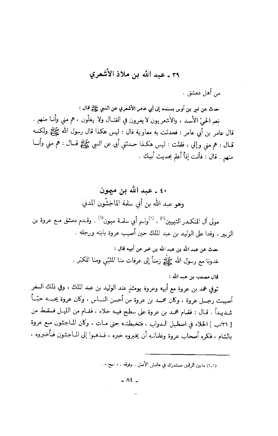 حدث عن نمير بن أوس بسنده إلى آبي عامر الأشعري عن النبي صَلَّى اللهُ عَلَيْهِ وَسَلَّمَ قال: نعم الحي الأسد، والأشعريون لا يفرون في القتال ولا يغلون، هم مني وأنا منهم. قال عامر بن أبي عامر: فحدثت به معاوية قال: ليس هكذا قال رسول الله صَلَّى اللهُ عَلَيْهِ وَسَلَّمَ ولكنه قال: هم مني وإلي، فقلت: ليس هكذا حدثني أبي عن النبي صَلَّى اللهُ عَلَيْهِ وَسَلَّمَ قال: هم مني وأنا منهم. قال: فأنت إذاً أعلم بحديث أبيك.