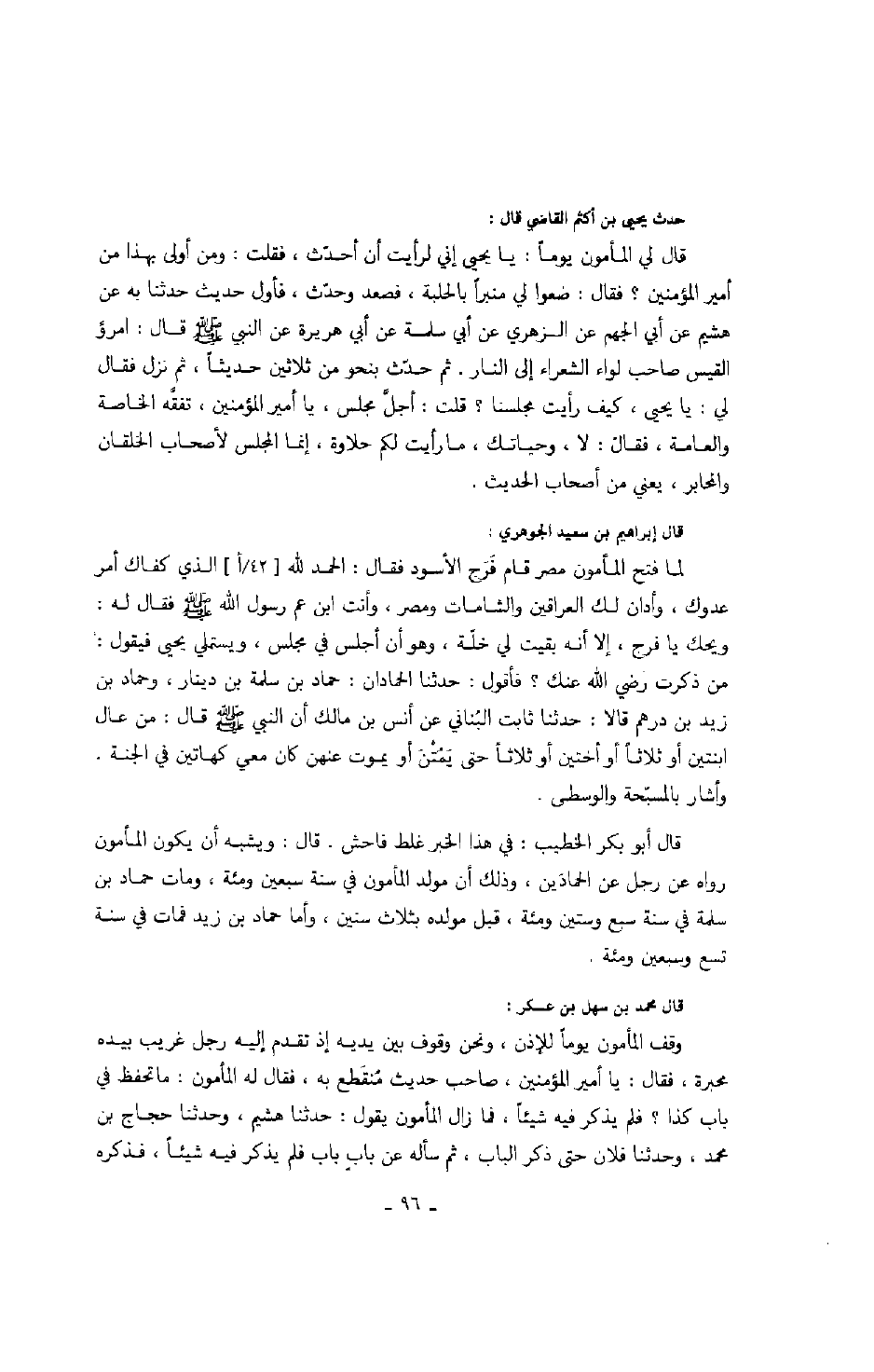 قال إبراهيم بن سعيد الجوهري: لما فتح المأمون مصر قام فرج الأسود فقال: الحمد الله الذي كفاك أمر عدوك، وأدان لك العراقين والشامات ومصر، وأنت ابن عم رسول الله صَلَّى اللهُ عَلَيْهِ وَسَلَّمَ فقال له: ويحك يا فرج، إلا أنه بقيت لي خلة، وهو أن أجلس في مجلس، ويستملي يحيى فيقول: من ذكرت رضي الله عنك؟ فأقول: حدثنا الحمادان: حماد بن سلمة بن دينار، وحماد بن زيد بن درهم قالا: حدثنا ثابت البناني عن أنس بن مالك أن النبي صَلَّى اللهُ عَلَيْهِ وَسَلَّمَ قال: من عال ابنتين أو ثلاثاً أو أختين أو ثلاثاً حتى يمتن أو يموت عنهن كان معي كهاتين في الجنة. وأشار بالمسبحة والوسطى.