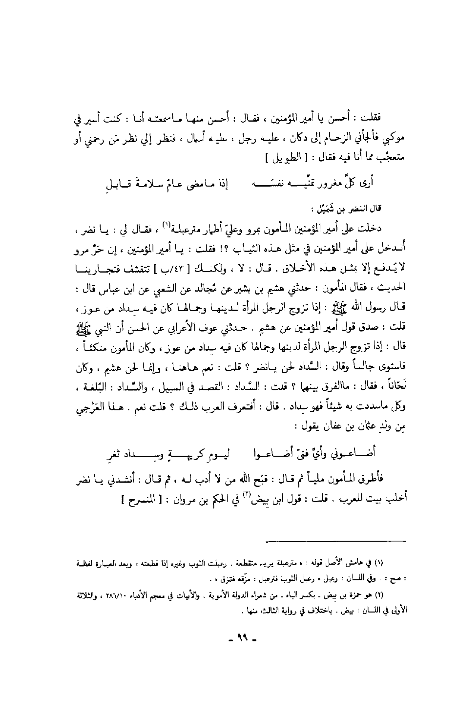 دخلت على أمير المؤمنين المأمون بمرو وعلي أطمار متر عبلة، فقال لي: يا نضر، أتدخل على أمير المؤمنين في مثل هذه الثياب؟! فقلت: يا أمير المؤمنين، إن حر مرو لا يدفع إلا بمثل هذه الأخلاق. قال: لا، ولكنك تتقشف فتجارينا الحديث، فقال المأمون: حدثني هشيم بن بشير عن مجالد عن الشعبي عن ابن عباس قال: قال رسول الله صَلَّى اللهُ عَلَيْهِ وَسَلَّمَ: إذا تزوج الرجل المرأة لدينها وجمالها كان فيه سداد من عوز، قلت: صدق قول أمير المؤمنين عن هشيم. حدثني عوف الأعرابي عن الحسن أن النبي صَلَّى اللهُ عَلَيْهِ وَسَلَّمَ قال: إذا تزوج الرجل المرأة لدينها وجمالها كان فيه سداد من عوز، وكان المأمون متكئاً، فاستوى جالساً وقال: السداد لحن يا نضر؟ قلت: نعم هاهنا، وإنما لحن هشيم، وكان لحاناً، فقال: ما الفرق بينهما؟ قلت: السداد: القصد في السبيل، والسداد: البلغة، وكل ما سددت به شيئاً فهو سداد. قال: أفتعرف العرب ذلك؟ قلت نعم. هذا العرجي من ولد عثمان بن عفان يقول:
