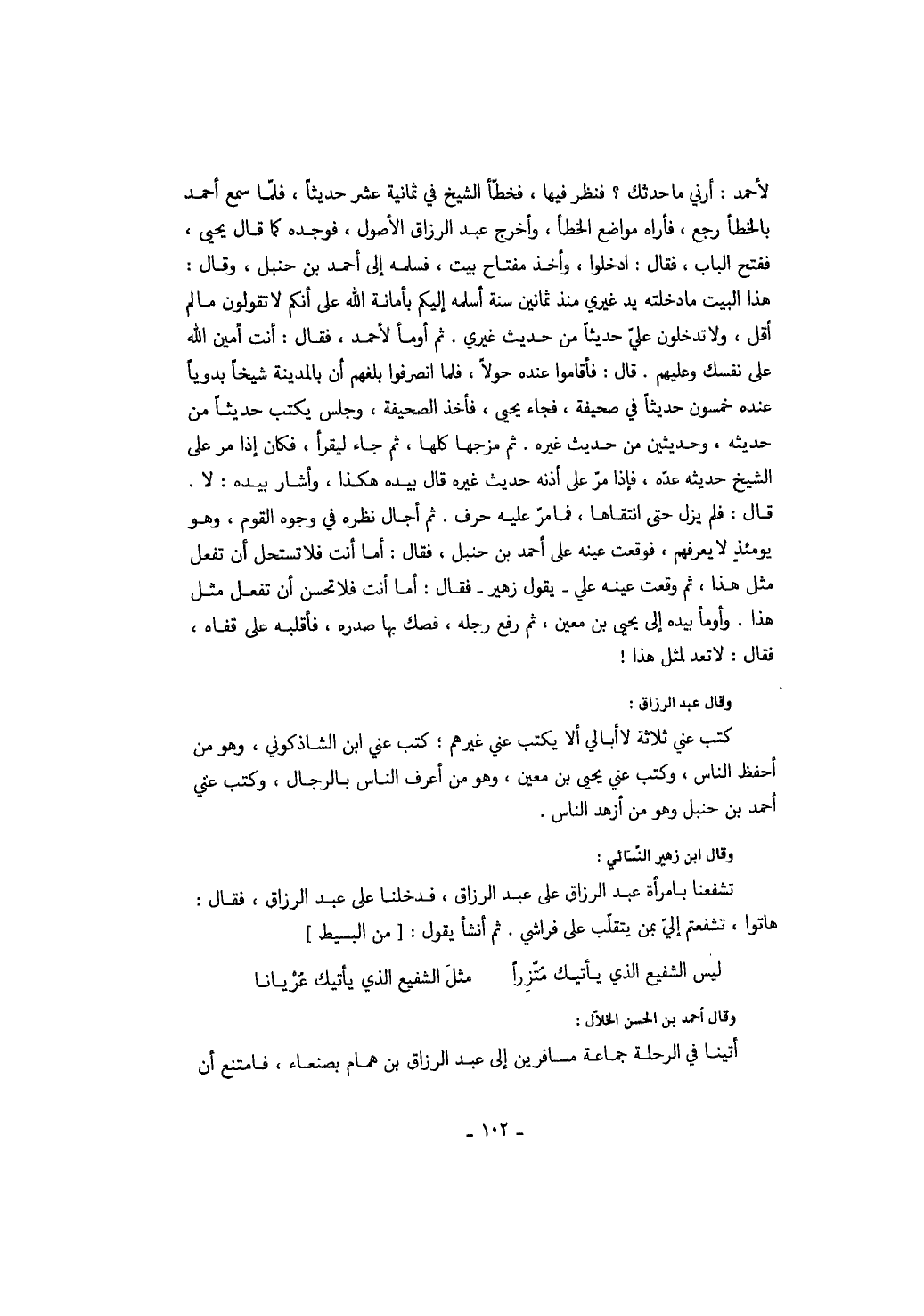 لأحمد: أرني ماحدثك؟ فنظر فيها، فخطأ الشيخ في ثمانية عشر حديثاً، فلما سمع أحمد بالخطأ رجع، فأراه موضع الخطأ، وأخرج عبد الرزاق الأصول، فوجده كما قال يحيى، ففتح الباب، فقال: ادخلوا، وأخذ مفتاح بيت، فسلمه إلى أحمد بن حنبل، وقال: هذا البيت ماد خلته يد غيري منذ ثمانين سنة أسلمه إليكم بأمانة الله على أنكم لا تقولون مالم أقل، ولاتدخلون علي حديثاً من حديث غيري. ثم أومأ لأحمد، فقال: أنت أمين الله على نفسك وعليهم. قال: فأقاموا عنده حولاً، فلما انصرفوا بلغهم أن بالمدينة شيخاً بدوياً عنده خمسون حديثاً في صحيفة، فجاء يحيى، فأخذ الصحيفة، وجلس يكتب حديثاً من حديثه، وحديثين من حديث غيره. ثم مزجها كلها، ثم جاء ليقرأ، فكان إذا مر على الشيخ حديثه عده، فإذا مر على أذنه حديث غيره قال بيده هكذا، وأشار بيده: لا. قال: فلم يزل حتى انتقاها، فما مر عليه حرف. ثم أجال نظره في وجوه القوم، وهو يومئذ لا يعرفهم، فوقعت عيناه على أحمد بن حنبل، فقال: أما أنت فلا تستحل أن تفعل مثل هذا، ثم وقعت عينه علي - يقول زهير - فقال: أما أنت فلا تحسن أن تفعل مثل هذا. وأومأ بيده إلى يحيى بن معين، ثم رفع رجله، فصك بها صدره، فأقلبه على قفاه، فقال: لاتعد لمثل هذا! وقال عبد الرزاق: كتب عني ثلاثة لا أبالي ألا يكتب عني غيرهم؛ كتب عني ابن الشاذكوني، وهو من أحفظ الناس، وكتب عني يحيى بن معين، وهو من أعرف الناس بالرجال، وكتب عني أحمد بن حنبل وهو من أزهد الناس.