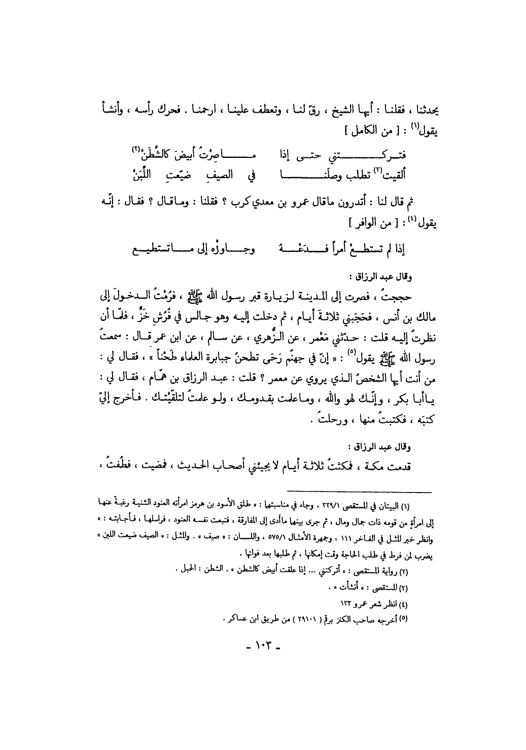 ثم قال لنا: أتدرون ما قال عمرو بن معدي كرب؟ فقلنا: وما قال؟ فقال: إنه يقول: من الوافر