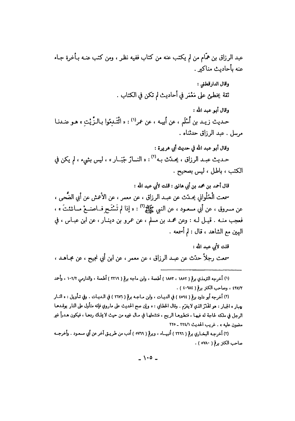 وقال الدارقطني: ثقة يخطىء على معمر في أحاديث لم تكن في الكتاب وقال أبو عبد الله: حديث زيد بن أسلم، عن أبيه، عن عمر: " ائتدموا بالزيت " هو عندنا مرسل. عبد الرزاق حدثناه.