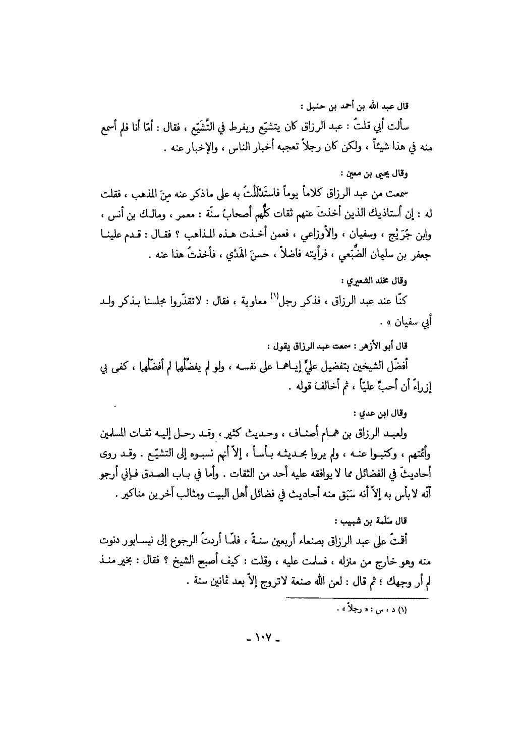 قال عبد الله بن أحمد بن حنبل: سألت أبي قلت: عبد الرزاق كان يتشيع ويفرط في التشيع، فقال: أما أنا فلم أسمع منه في هذا شيئاً، ولكن كان رجلاً تعجبه أخبار الناس، والإخبار عنه.