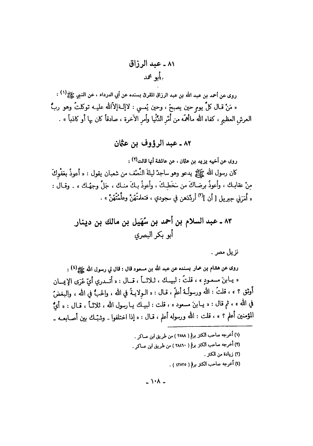 روى عن هشام بن عمار بسنده عن عبد الله بن مسعود قال: قال لي رسول الله صَلَّى اللهُ عَلَيْهِ وَسَلَّمَ " يا بن مسعود "، قلت: لبيك، ثلاثاً، قال: " أتدري أي عرى الإيمان أوثق؟ "، قلت: الله ورسوله أعلم، قال: " الولاية في الله، والحب في الله، والبغض في الله "، ثم قال: " يا بن مسعود "، قلت: لبيك يا رسول الله، ثلاثا "، قال: " أي المؤمنين أعلم؟ "، قلت: الله ورسوله أعلم، قال: " إذا اختلفوا - وشبك بين أصابعه -
