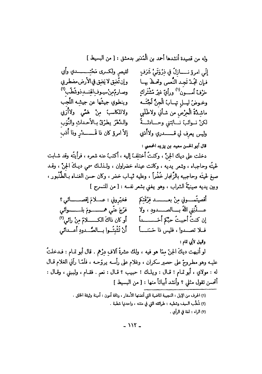 وقيل لأبي تمام: لو أنبهت ديك الجن مما هو فيه، ولك عشرة آلاف درهم. قال أبو تمام: فدخلت عليه وهو مطروح على حصير سكران، وغلام على رأسه يروحه، فلما رآني الغلام قال له: مولاي، أبو تمام! قال: ويلك! حبيب؟ قال: نعم. فقام، ولببني، قال: أتحسن تقول مثلي؟ وأنشد أبياتاً منها: من البسيط