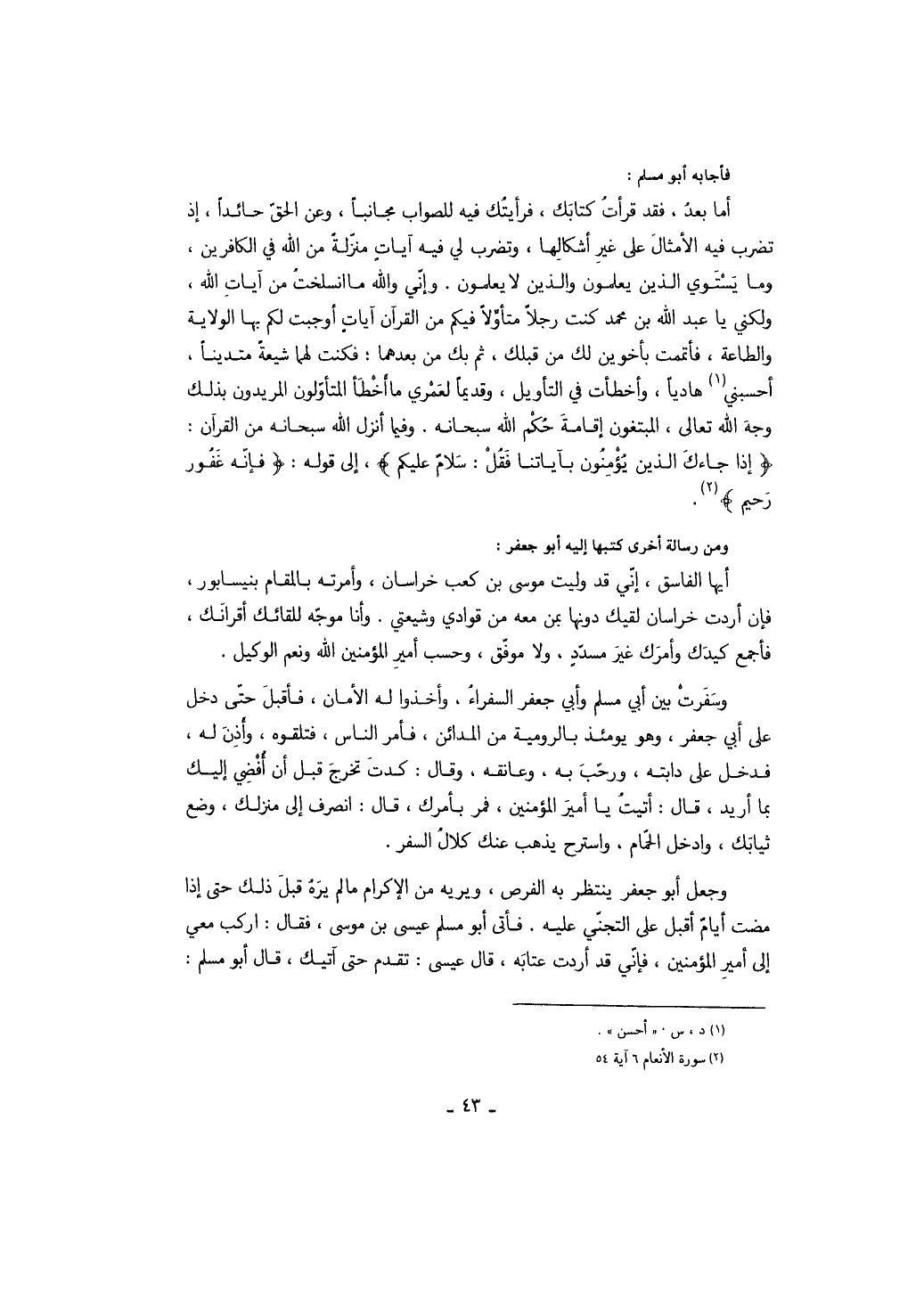 فأجابه أبو مسلم: أما بعد، فقد قرأت كتابك، فرأيتك فيه للصواب مجانباً، وعن الحق حائداً، إذ تضرب فيه الأمثال على غير أشكالها، وتضرب لي فيه آيات منزلة " من الله في الكافرين، وما يستوي الذين يعلمون والذين لا يعلمون. وإني والله ما انسلخت من آيات الله، ولكن يا عبد الله بن محمد كنت رجلاً متأولاً فيكم من القرآن آياتٍ أوجبت لكم بها الولاية والطاعة، فأتممت بأخوين لك من قبلك، ثم بك من بعدهما؛ فكنت لهم شيعة " متديناً، أحسبني هادياً، وأخطأت في التأويل، وقديماً لعمري ما أخطأ المتأولون المريدون بذلك وجه الله تعالى، المبتغون إقامة حكم الله سبحانه. وفيما أنزل الله سبحانه من القرآن: " إذا جاءك الذين يؤمنون بآياتنا فقل: سلام عليكم "، إلى قوله: " فإنه غفور رحيم " ومن رسالة أخرى كتبها إليه أبو جعفر: أيها الفاسق، إني وليت موسى بن كعب خراسان، وأمرته بالمقام بنيسابور، فإن أردت خراسان لقيك دونها بمن معه من قوادي وشيعتي. وأنا موجه للقائك أقرانك، فاجمع كيدك وأمرك غير مسددٍ، ولا موفق، وحسب أمير المؤمنين الله ونعم الوكيل.