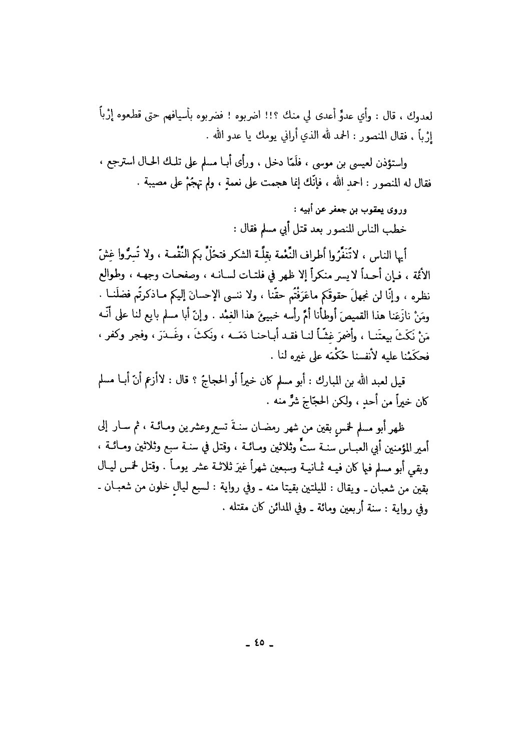 لعدوك، قال: وأي عدو أعدى لي منك؟!! اضربوه! فضربوه بأسيافهم حتى قطعوه إرباً إرباً، فقال المنصور: الحمد لله الذي أراني يومك يا عدو الله.