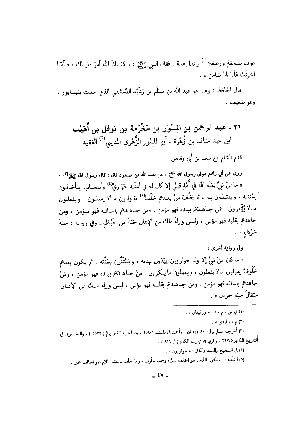 روى عن أبي رافع مولى رسول الله صَلَّى اللهُ عَلَيْهِ وَسَلَّمَ، عن عبد الله بن مسعود قال: قال رسول الله صَلَّى اللهُ عَلَيْهِ وَسَلَّمَ: " ما من نبي بعثه الله في أمةٍ قبلي إلا كان له في أمته حواري وأصحاب يأخذون بسنته، ويقتدون به، ثم يخلف من بعدهم خلف يقولون مالا يفعلون، ويفعلون مالا يؤمرون، فمن جاهدهم بيده فهو مؤمن، ومن جاهدهم بلسانه فهو مؤمن، ومن جاهدهم بقلبه فهو مؤمن، وليس وراء ذلك من الإيمان حبة من خردل - وفي رواية: حبة خردل " ".