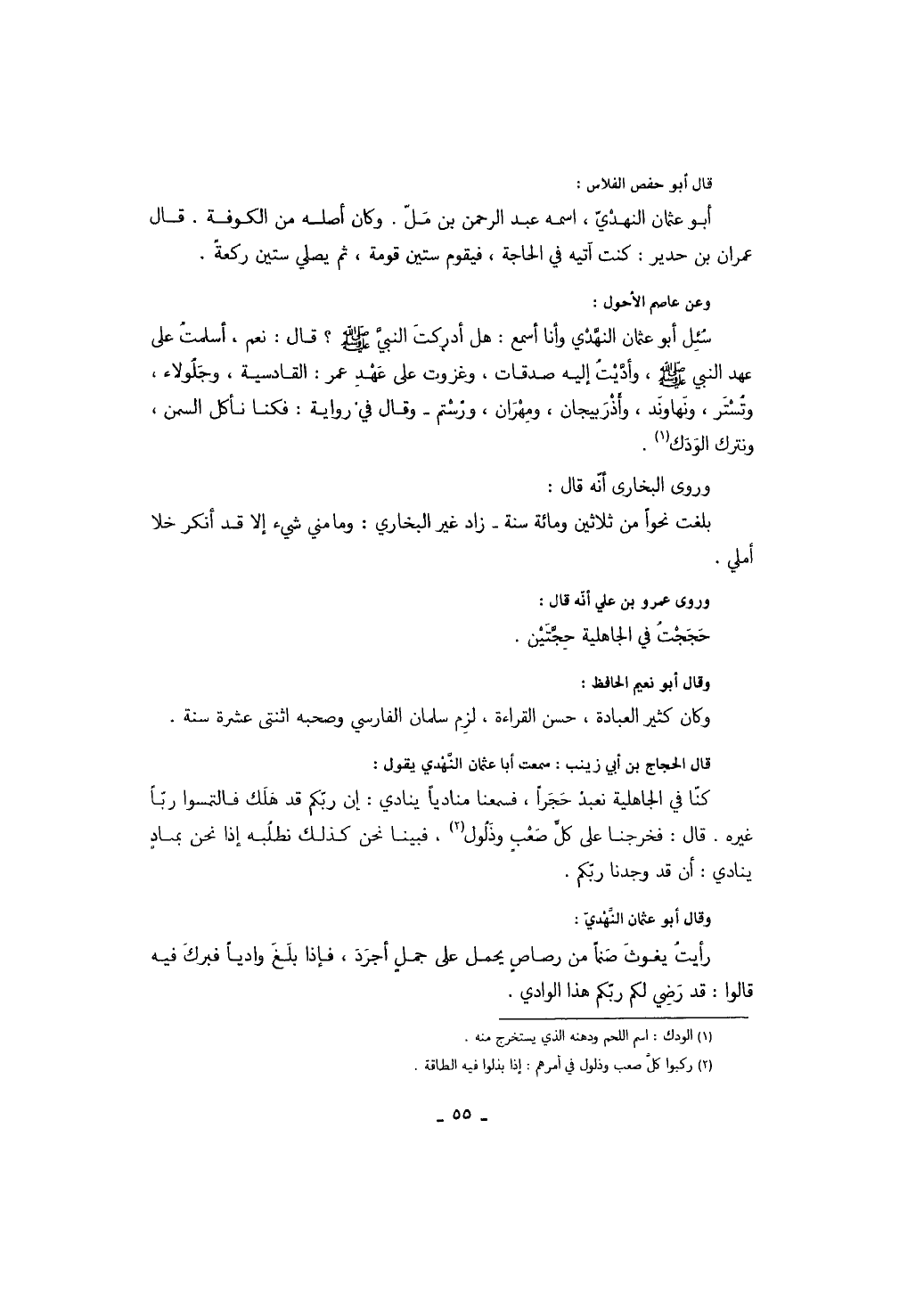 سئل أبو عثمان النهدي وأنا أسمع: هل أدركت النبي صَلَّى اللهُ عَلَيْهِ وَسَلَّمَ؟ قال: نعم، أسلمت على عهد النبي صَلَّى اللهُ عَلَيْهِ وَسَلَّمَ، وأديت إليه صدقات، وغزوت على عهد عمر: القادسية، وجلولاء، وتستر، ونهاوند، وأذربيجان، ومهران، ورستم - وقال في رواية: فكنا نأكل السمن، ونترك الودك.
