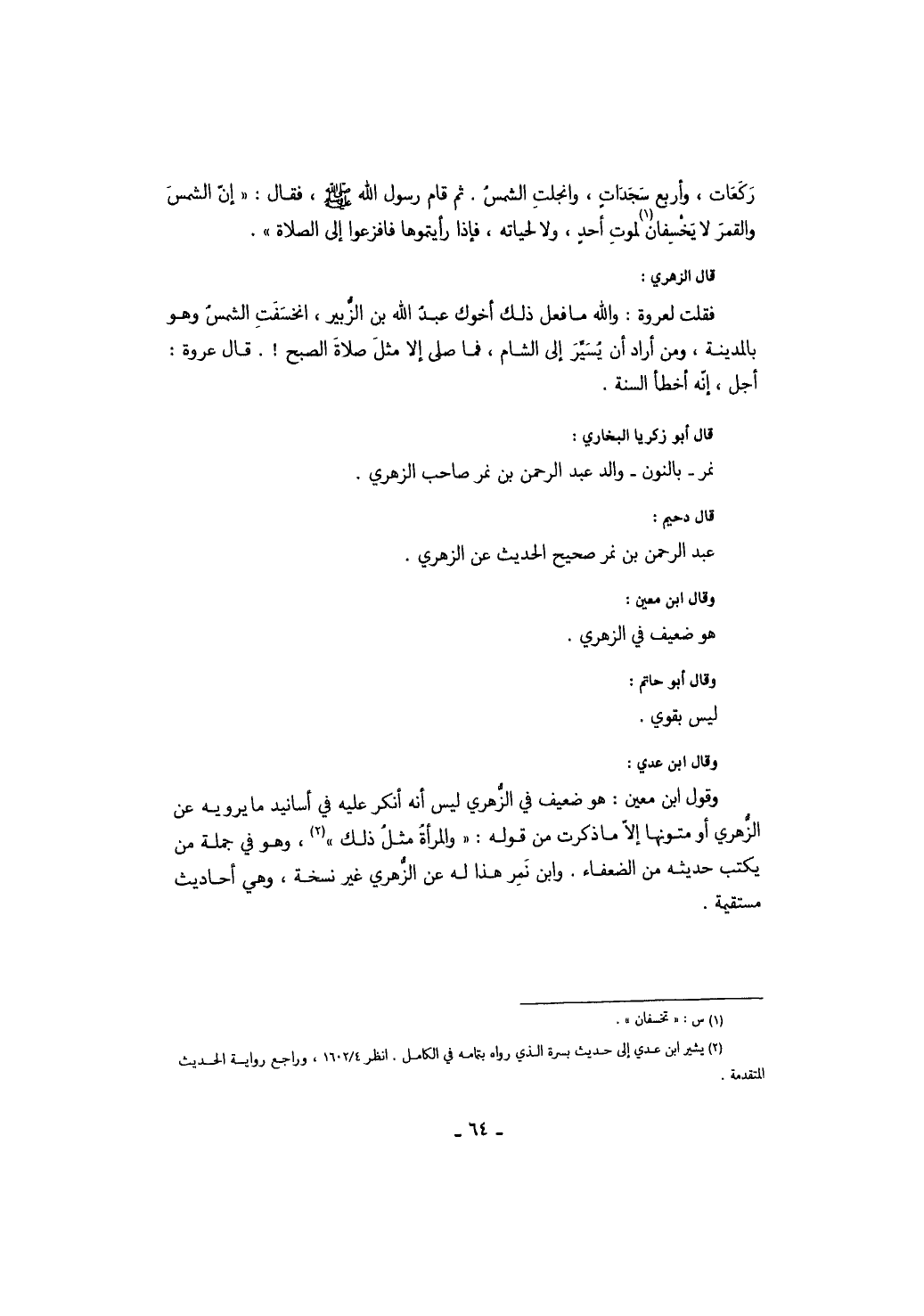 ركعات وأربع سجدات، وانجلت الشمس. ثم قام رسول الله صَلَّى اللهُ عَلَيْهِ وَسَلَّمَ، فقال: " إن الشمس والقمر لا يخسفان لموت أحدٍ، ولا لحياته، فإذا رأيتموهما فافزعوا إلى الصلاة. " قال الزهري: فقلت لعروة: والله ما فعل ذلك أخوك عبد الله بن الزبير، انخسفت الشمس وهو بالمدينة، ومن أراد أن يسير إلى الشام، فما صلى إلا مثل صلاة الصبح!. قال عروة: أجل، إنه أخطأ السنة قال أبو زكريا البخاري: نكر - بالنون - والد عبد الرحمن بن نمر صاحب الزهري قال دحيم: عبد الرحمن بن نمر صحيح الحديث عن الزهري وقال ابن معين: هو ضعيف في الزهري وقال أبو حاتم: ليس بقوي وقال ابن عدي: وقول ابن معين: هو ضعيف في الزهري ليس أنه أنكر عليه في أسانيد ما يرويه عن الزهري أو متونها إلا ما ذكرت من قوله: " والمرأة مثل ذلك "، وهو في جملة ن يكتب حديثه من الضعفاء. وابن نمر هذا له عن الزهري غير نسخة، وهي أحاديث مستقيمة.