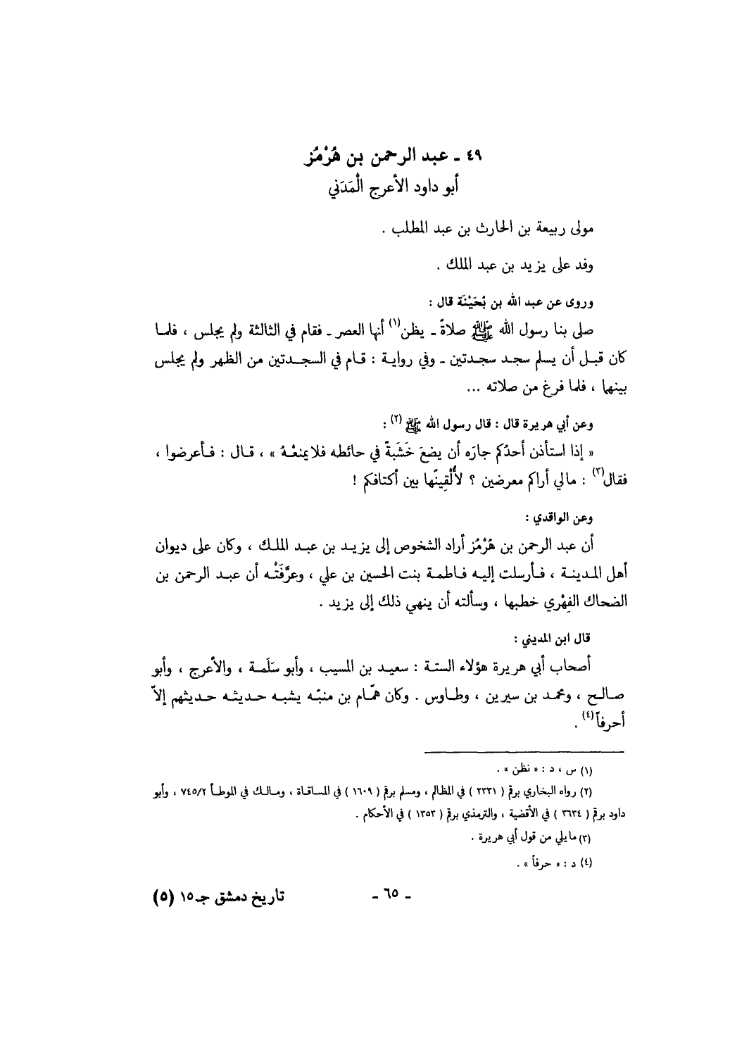 " إذا استأذن أحدكم جاره أن يضع خشبة " في حائطه فلا يمنعه "، قال: فأعرضوا، فقال: مالي أراكم معرضين؟ لألقينها بين أكتافكم! وعن الواقدي: أن عبد الرحمن بن هرمز أراد الشخوص إلى يزيد بن عبد الملك، وكان على ديوان أهل المدينة، فأرسلت إليه فاطمة بنت الحسين بن علي، وعرفته أن عبد الرحمن بن الضحاك الفهري خطبها، وسألته أن ينهي ذلك إلى يزيد.